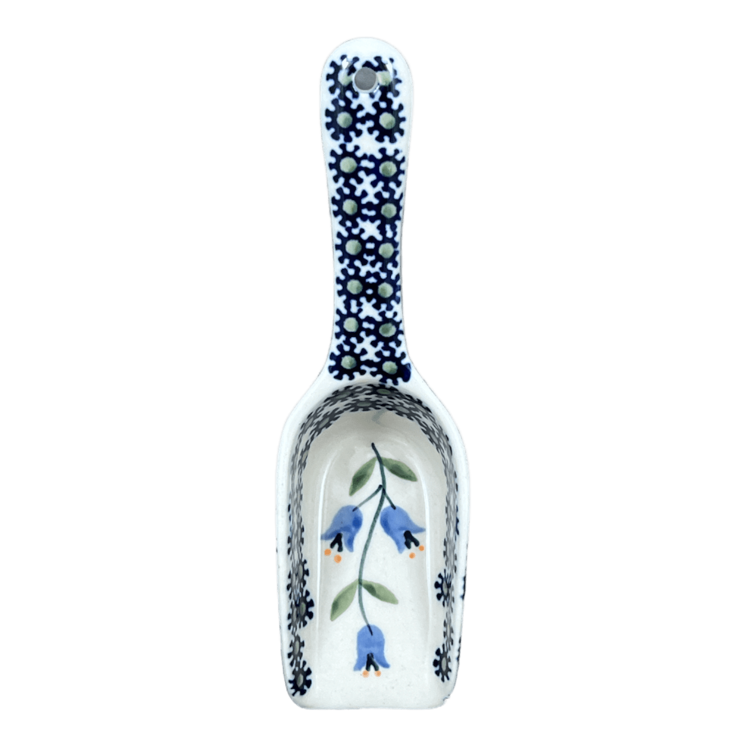 Imagine a morning where every scoop of coffee or sugar is a little journey to the heart of Poland. This isn't just any scoop; it's a 7" Polish Pottery Scoop from Manufaktura, adorned with the enchanting "Lily of the Valley" pattern. This lovely design captures the essence of a white background blooming with light blue bellflowers twined around lush green vines. The vibrant blues and soothing greens bring a touch of Polish spring right into your kitchen. Each piece, lovingly hand-painted in Boleslawiec, Poland, is not just a tool but a piece of art, offering both beauty and functionality to your daily routine.