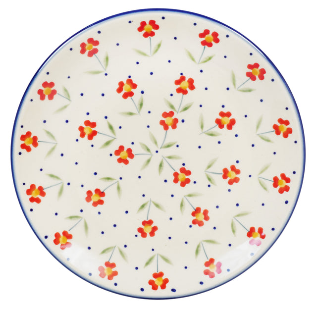 The "Simply Beautiful" pattern showcases a stunning design incorporating predominantly red flowers with accents in white and green. Bands of delicate red flowers with slender stems and small green petals adorn the entire pattern, while tiny blue dots add a touch of whimsy to the empty spaces. This pattern is considered to be of Traditional level of artistry, making it one of the most common and recognizable patterns in the world of Polish pottery.