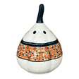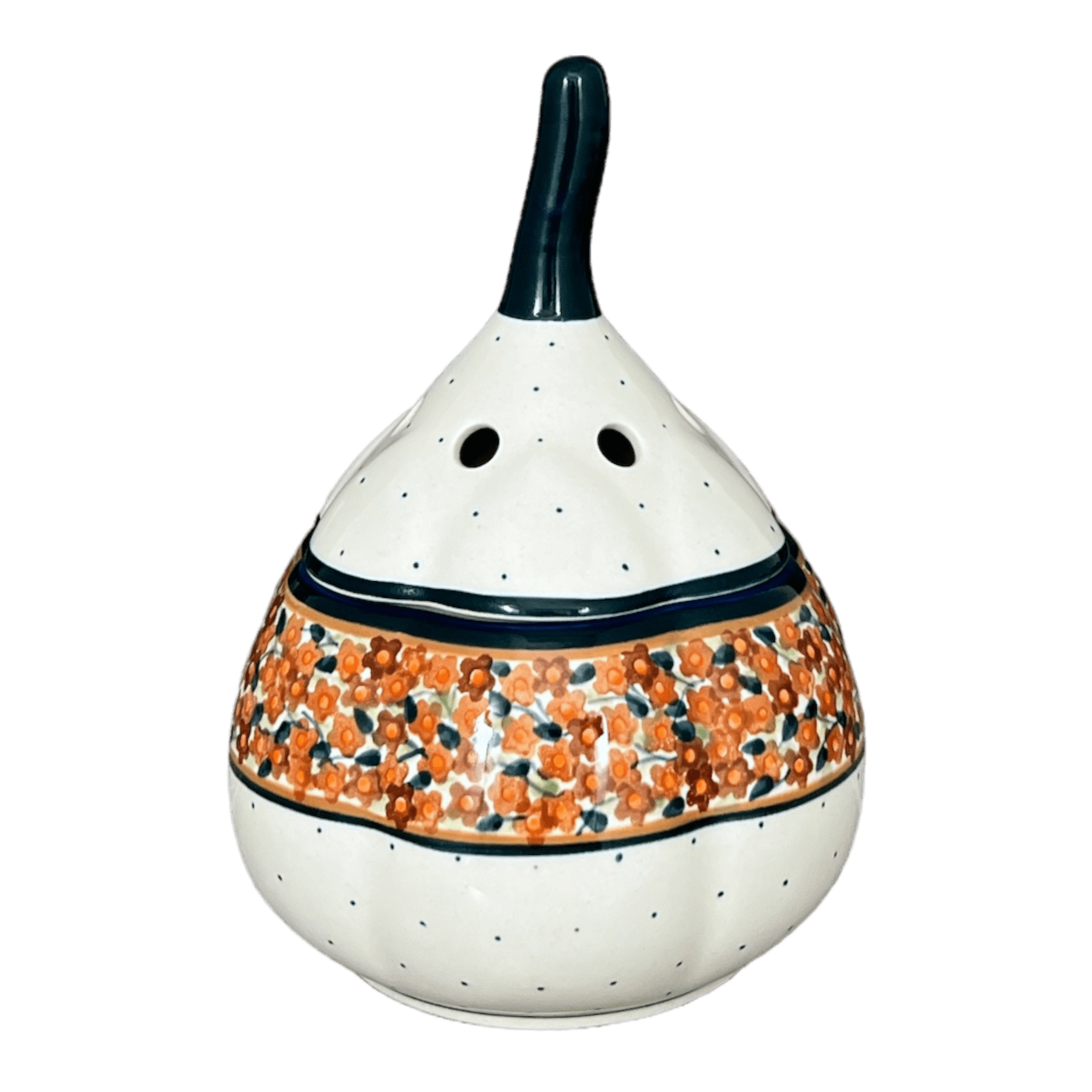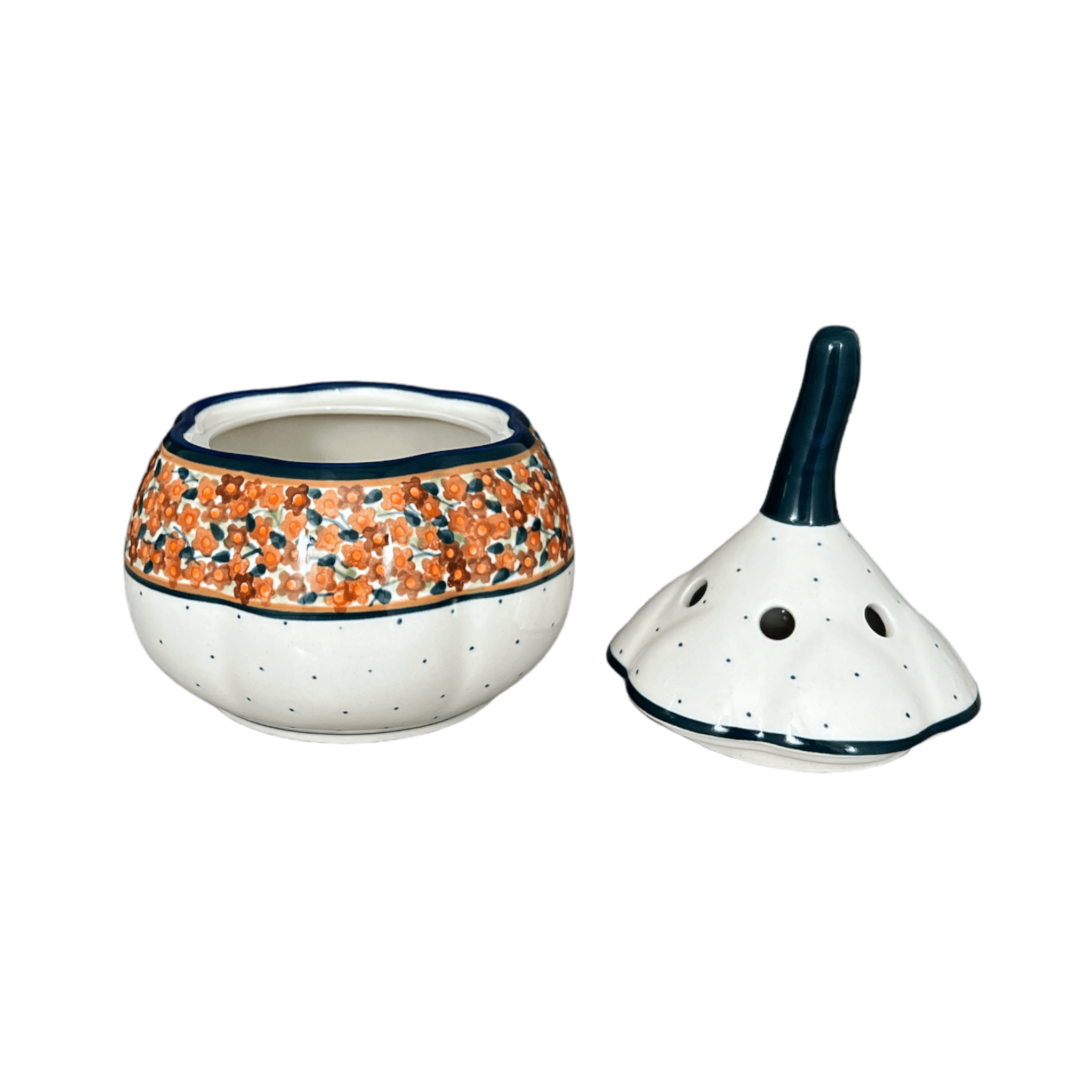 Introducing the enchanting Polish Pottery Garlic Keeper, a masterpiece of form and function, handcrafted by the revered artisans at Zaklady in Boleslawiec, Poland. This 8.5" tall treasure is adorned with the "Orange Wreath" pattern, a vibrant and lively design that features a delightful arrangement of brown, orange, and gold flowers encircling green leaves, set against a crisp white background speckled with tiny brown dots. Not only does this pattern dazzle the eye, but it also boasts the prestigious Unikat status, marking it as a unique piece of art with exceptional detail and a rich palette that elevates any kitchen decor.