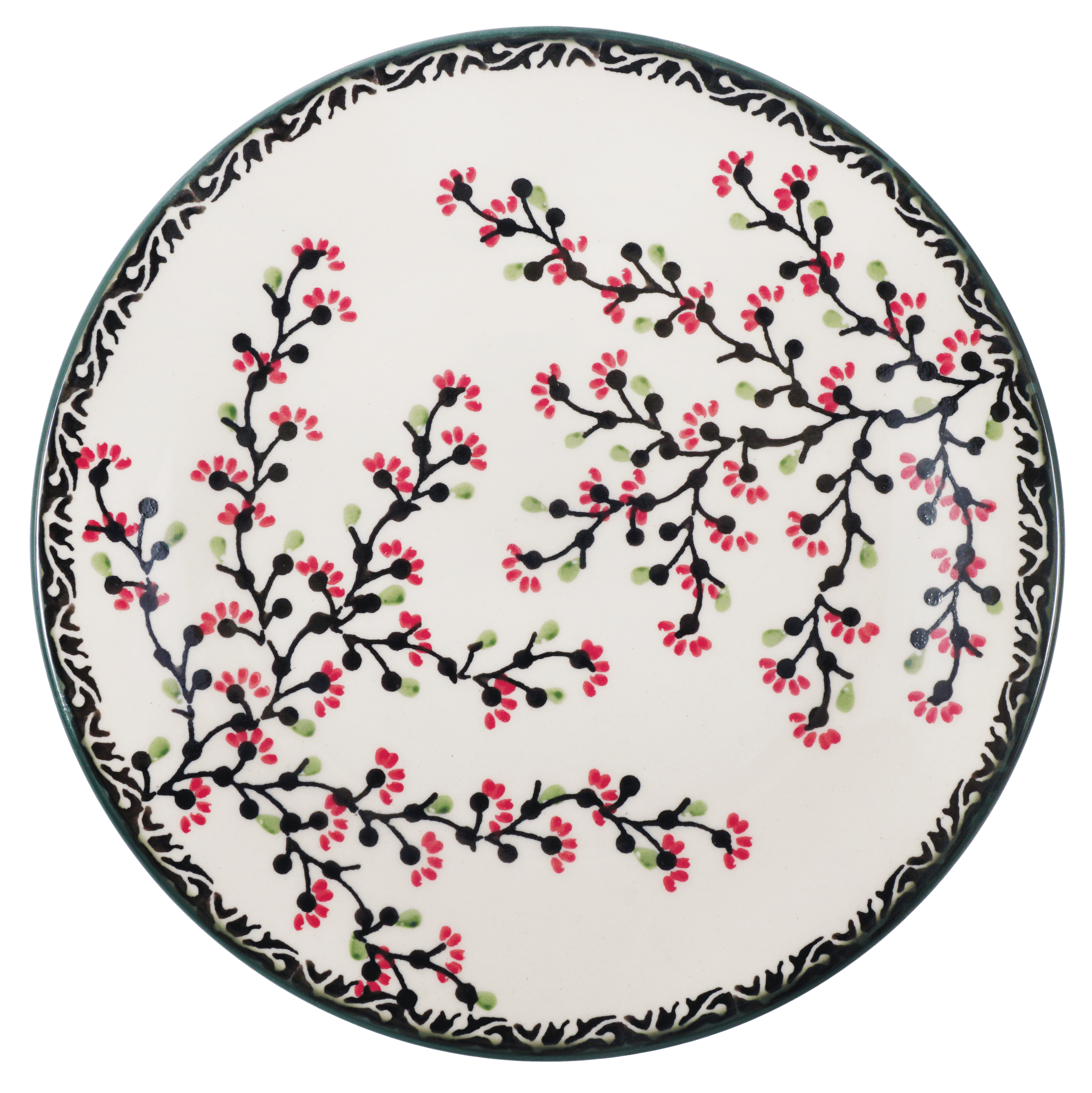 Imagine a canvas of pristine white, brought to life with vivid red cherry blossoms and intertwining black vines, each stroke meticulously hand-painted by the esteemed artisans of Manufaktura. The "Cherry Blossoms - Solid Rim" pattern on this 8.5" Polish Pottery Plate isn't just a design; it's a piece of art. Each plate, bordered with a solid green rim, represents the pinnacle of craftsmanship known as the Signature level. Artists who achieve this prestigious rank have the honor of designing and overseeing each masterpiece from start to finish, ensuring that every plate is not only a delight to the eyes but also a coveted collector's item, complete with the artist's unique UNIKAT signature.