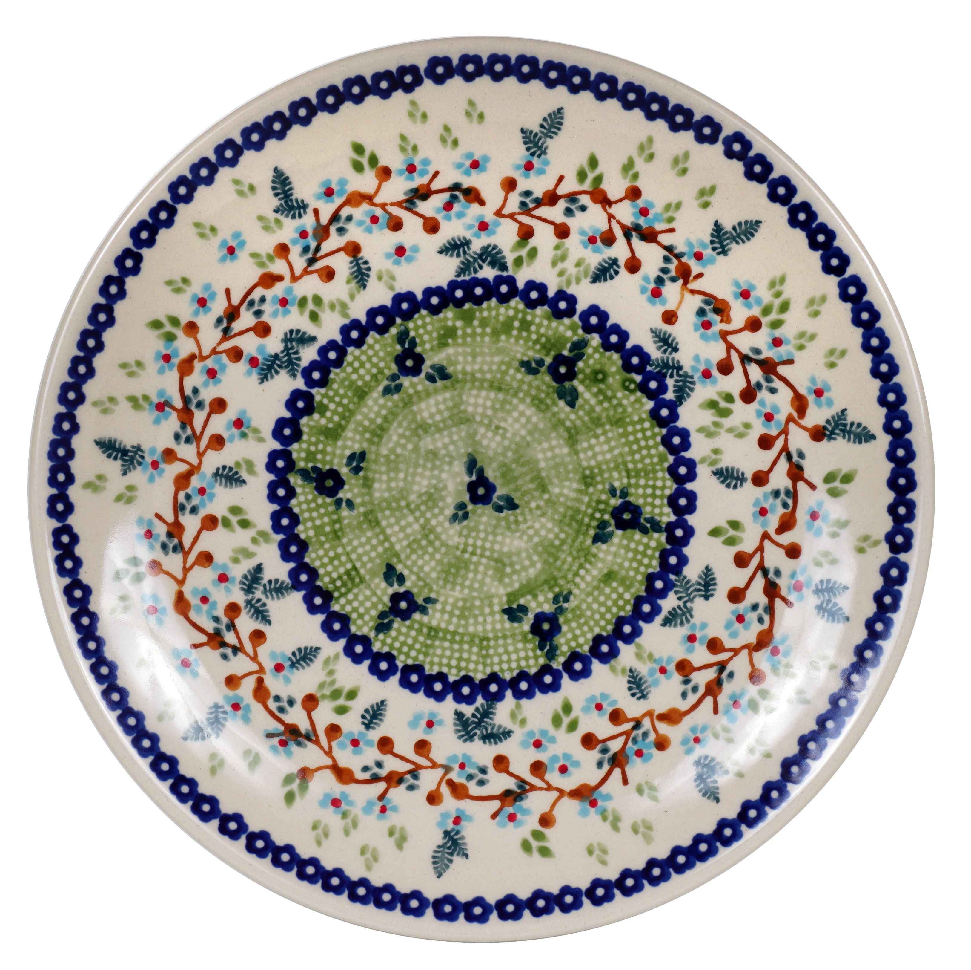 Adorned with the "Spring's Promise" pattern, this plate features a delightful dance of nature's beauty. The design blooms with bands of tiny, simple blue flowers and clusters of teal leaves set against a lush green backdrop sprinkled with white dots. A charming vine with sky blue and red flowers encircles the center, adding a whimsical touch. Each element of the pattern is hand-stamped using the ancient "punching" technique by skilled artisans, making every piece uniquely yours. Despite being termed 'simple', these patterns are a canvas of creativity, widely cherished for their joyful depiction of spring's awakening.