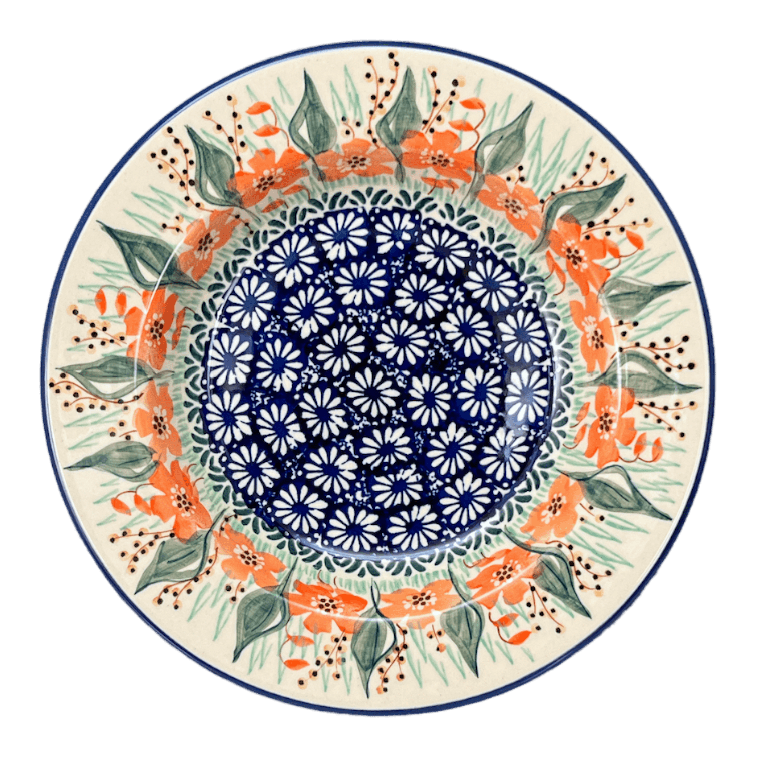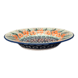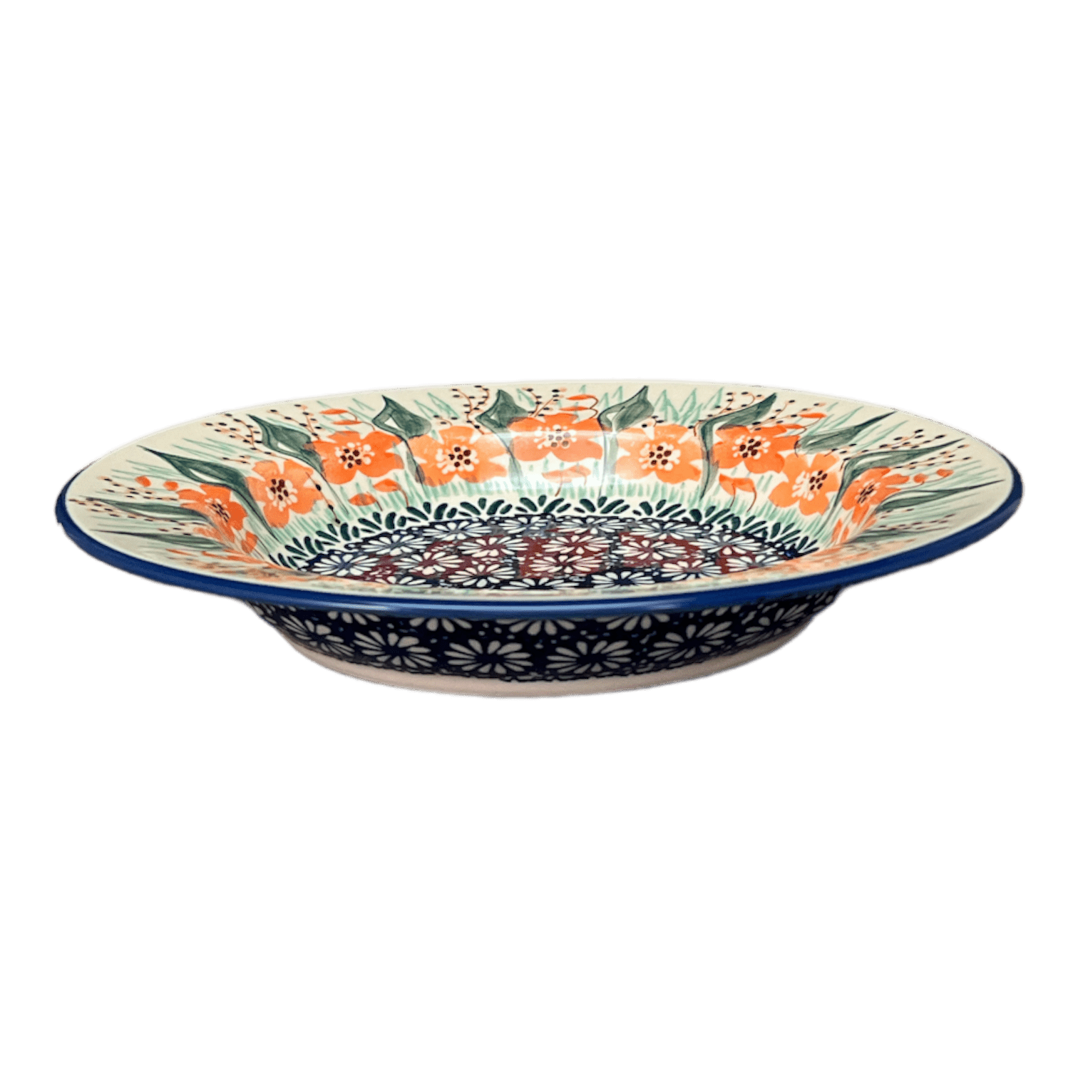 Introducing the exquisite Manufaktura Polish Pottery Soup Plate, a masterpiece of design and craftsmanship that brings the vibrant "Sun-Kissed Garden" pattern to your dining table. Each 9.25" round plate is a canvas of artistry, featuring a mesmerizing arrangement of small white flowers set against a deep blue backdrop, encircled by a lively dance of orange blooms and tall green grass. This isn’t just a plate; it's a portal to a lush, sunlit garden that promises to elevate your soups, salads, and pasta dishes into a visual feast. Hand-painted in Boleslawiec, Poland, by skilled artisans, this plate is a testament to the rich heritage and enduring charm of Polish pottery.