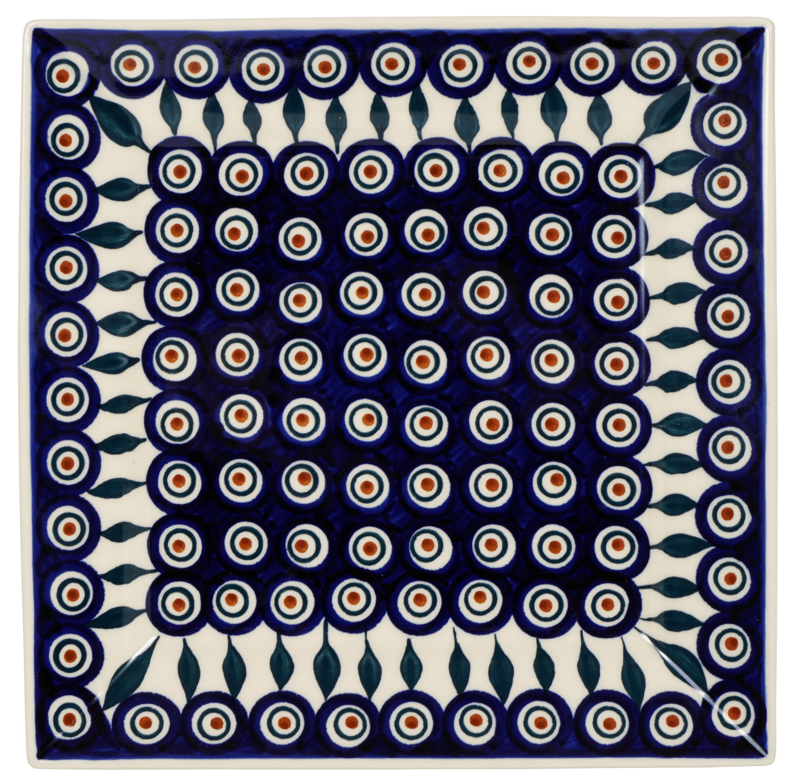 The "Peacock" pattern is a testament to the rich tradition and skilled craftsmanship of Polish pottery. At its heart lies a bold cluster of peacock circles set against a blue backdrop, surrounded by large teal green petals that stretch to the edges over a crisp white background. This pattern showcases the traditional artistry of Polish pottery, where each piece is handcrafted using the "punching" technique of hand stamping. Created by highly skilled artisans in Boleslawiec, Poland, this plate is a blend of both functional utility and breathtaking beauty, making it a perfect addition to any home.