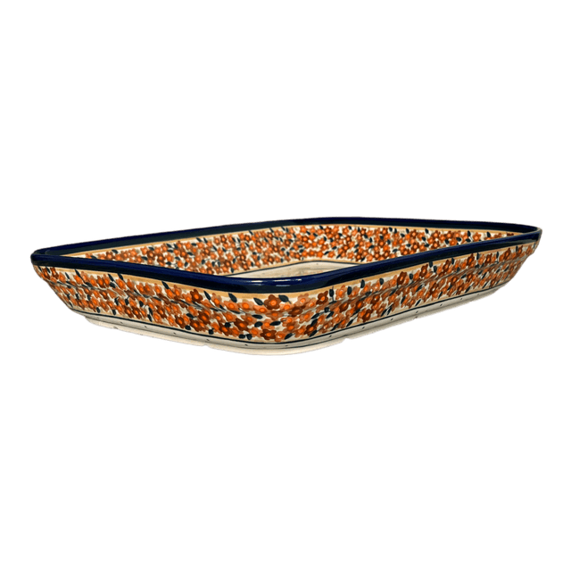 Step into a world where tradition meets artistry with the stunning Zaklady Polish Pottery Baker, a piece that transforms every kitchen event into a vibrant celebration. Perfectly sized at 10.5" x 13", this rectangular baker isn't just a utensil—it's a centerpiece. Imagine pulling a sizzling lasagna or a bubbling peach cobbler from your oven, the aroma filling the air, all nestled within the exquisite "Orange Wreath" pattern. This unique design blooms with a symphony of brown, orange, and gold flowers encircling green leaves, set against a crisp white background dotted with tiny brown specks. It’s a visual feast, ready to complement your culinary creations!