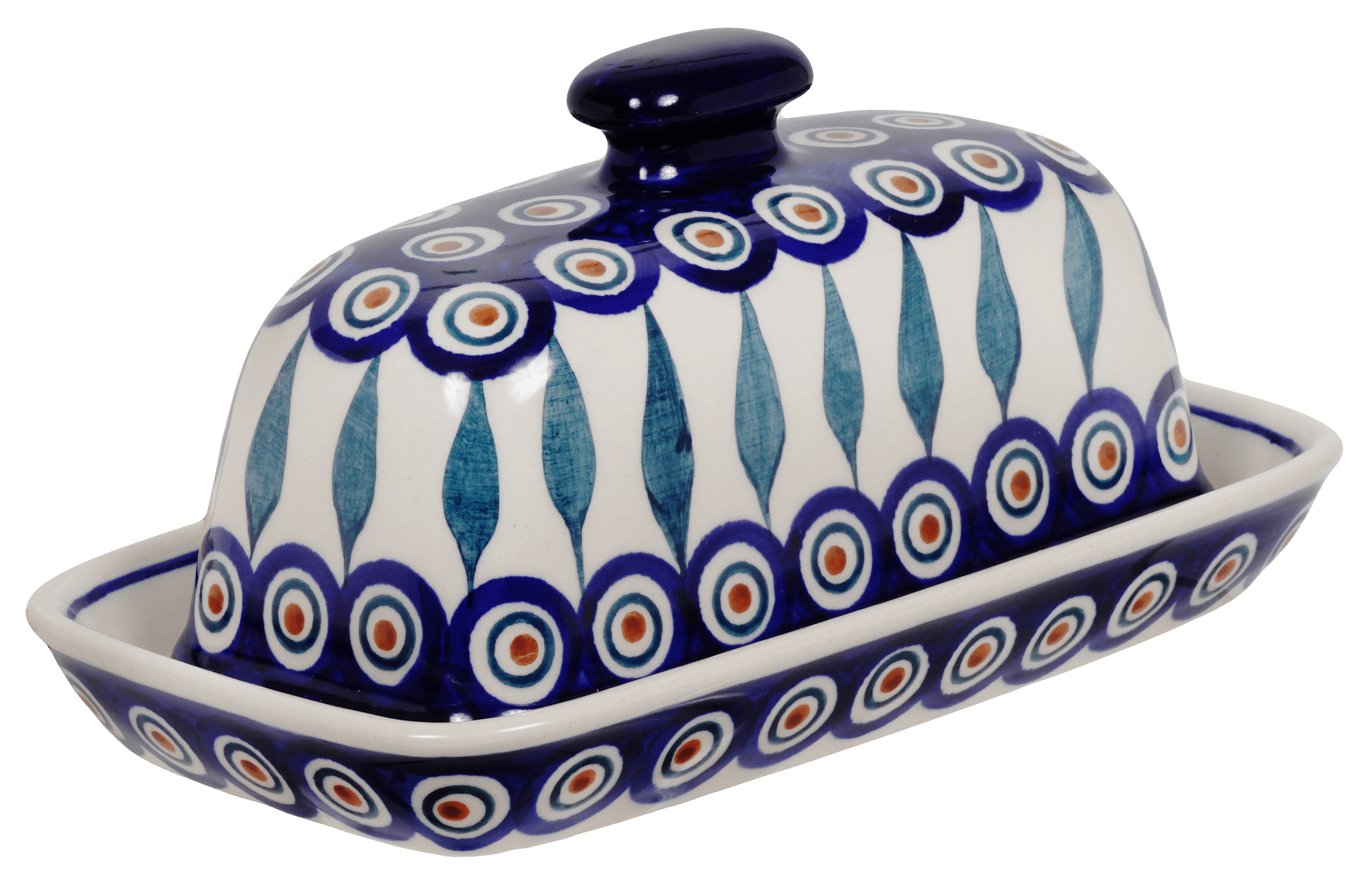Introducing the Polish Pottery 7.5" x 4" American Butter Dish by Manufaktura in the exquisite "Peacock" pattern! This butter dish is not only a functional kitchen accessory but also a stunning piece of art that will catch everyone's eye. With its vibrant colors and intricate design, it is the perfect home for your stick of butter or margarine.