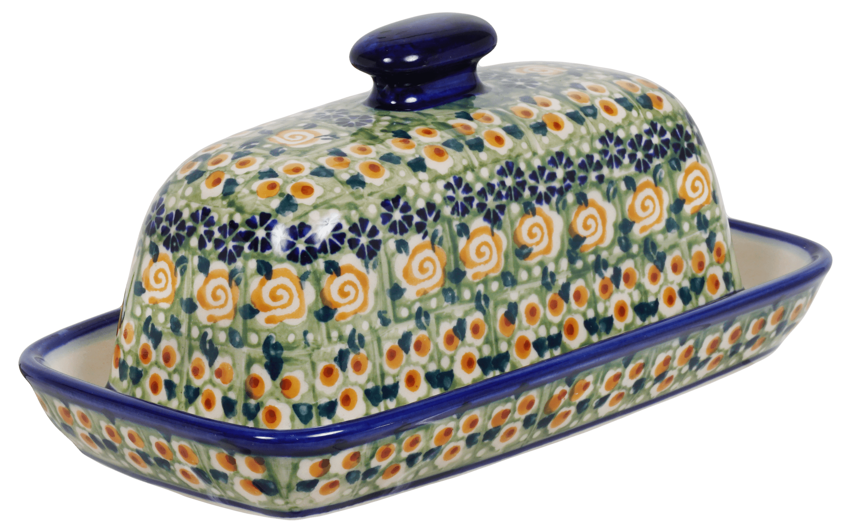 Butter Dish, American, 4" x 7.5" in "Perennial Garden" by Manufaktura | M074S-LM is backordered and will ship as soon as it is back in stock.
