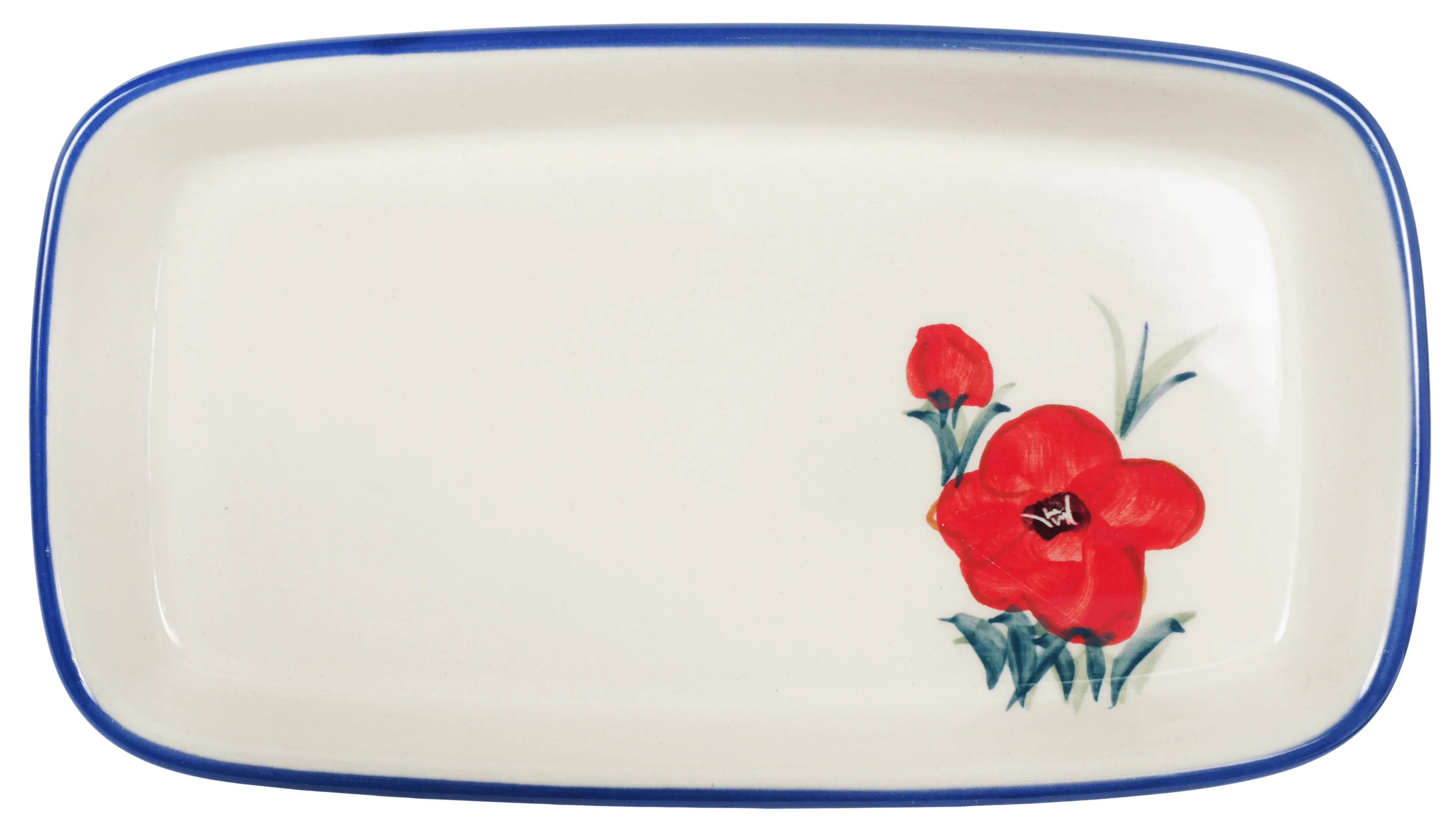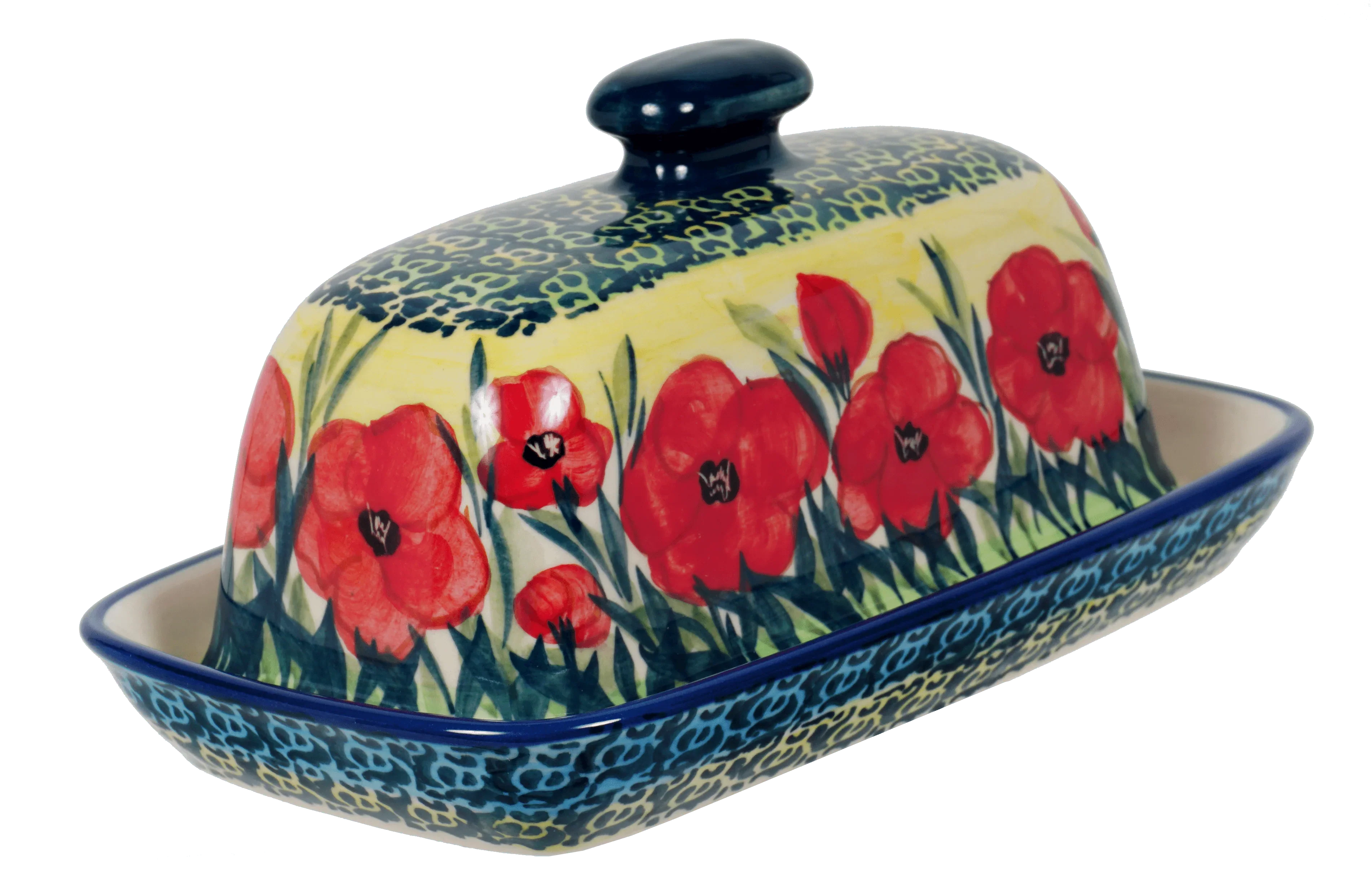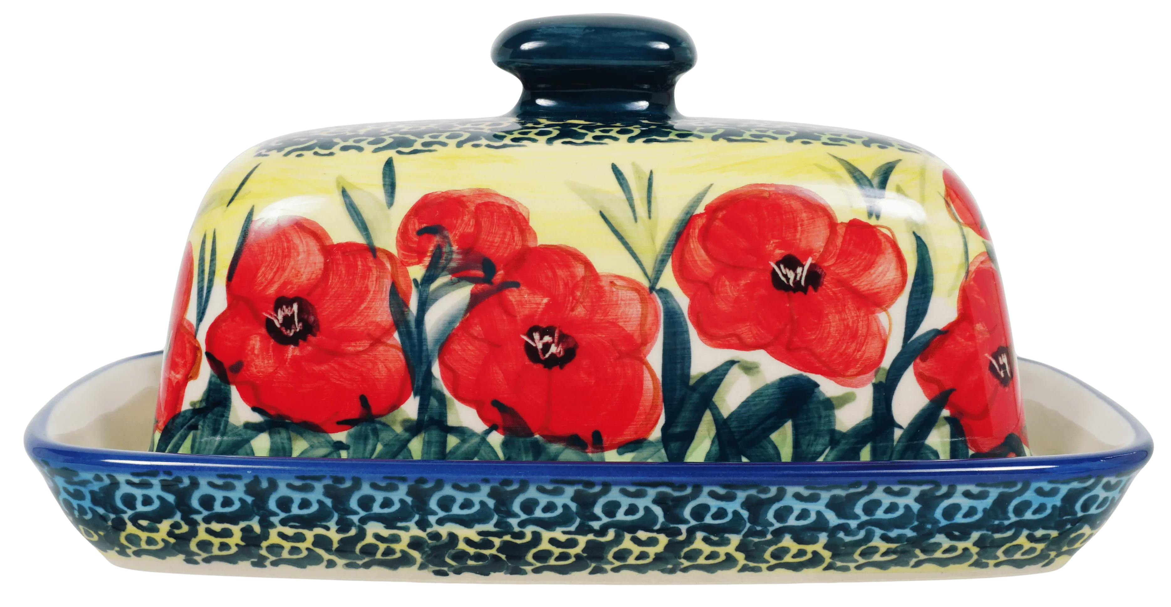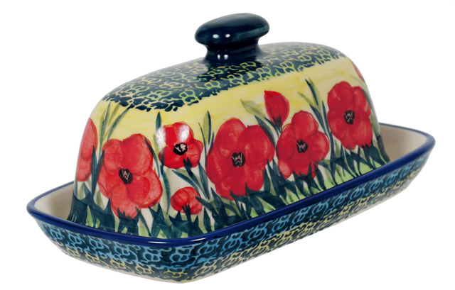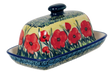 Introducing the Polish Pottery 7.5" x 4" American Butter Dish by Manufaktura, a must-have for every kitchen! Not only is it a practical home for your stick of butter or margarine, but it also adds a pop of color and style to your dining table. With its vibrant "Poppies in Bloom" pattern, featuring stunning flowers in a predominantly red color with accents in yellow, blue, and green, this butter dish is truly eye-catching.