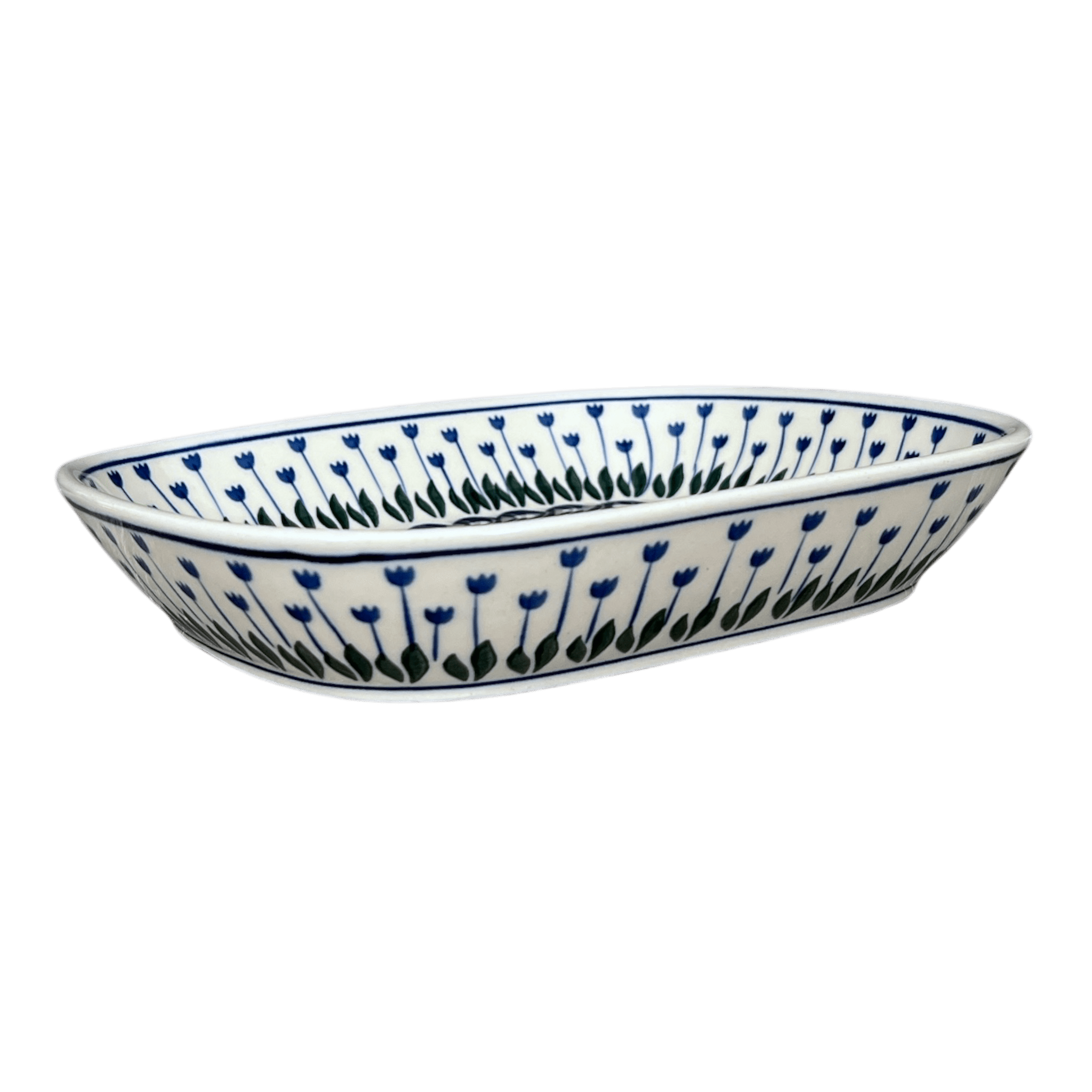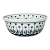 Imagine a splash of vibrant colors and intricate designs that transform your kitchen into a gallery of folk art. The Polish Pottery Baker in the enchanting "Tulip Dot" pattern does just that! Crafted by the renowned artisans of Ceramika Artystyczna in Boleslawiec, Poland, this rectangular baker measures 9" x 10.5" and is not just a baking dish but a piece of art. The "Tulip Dot" pattern is a joyful dance of white polka-dots set against a serene blue background, with charming blue tulips and lush green petals gracefully framing the design. This traditional pattern echoes the rich heritage and skilled craftsmanship that Polish pottery is celebrated for.