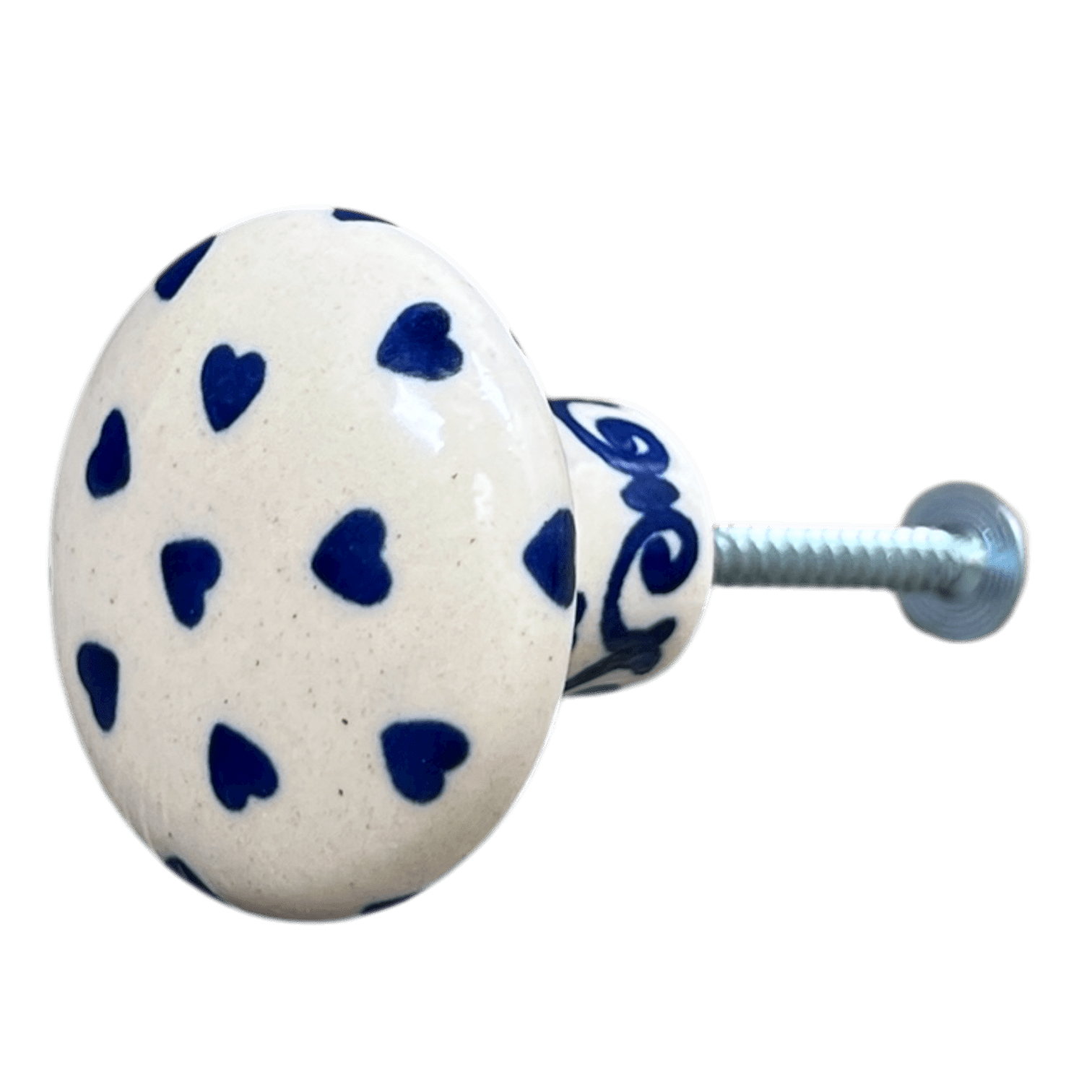 Transform the ordinary into the extraordinary with the Polish Pottery Drawer Pull from Manufaktura, featuring the captivating "Heartfelt Blue" pattern. Each 1.5-inch knob is a miniature masterpiece, adorned with cobalt blue hearts that dance across a pristine white background, surrounded by a gracefully swirled rim. These delightful pieces are not just drawer pulls—they're an invitation to infuse your home with a touch of traditional Polish artistry. Handcrafted in the heart of Boleslawiec, Poland, these knobs bring a piece of Polish heritage right into your living space.