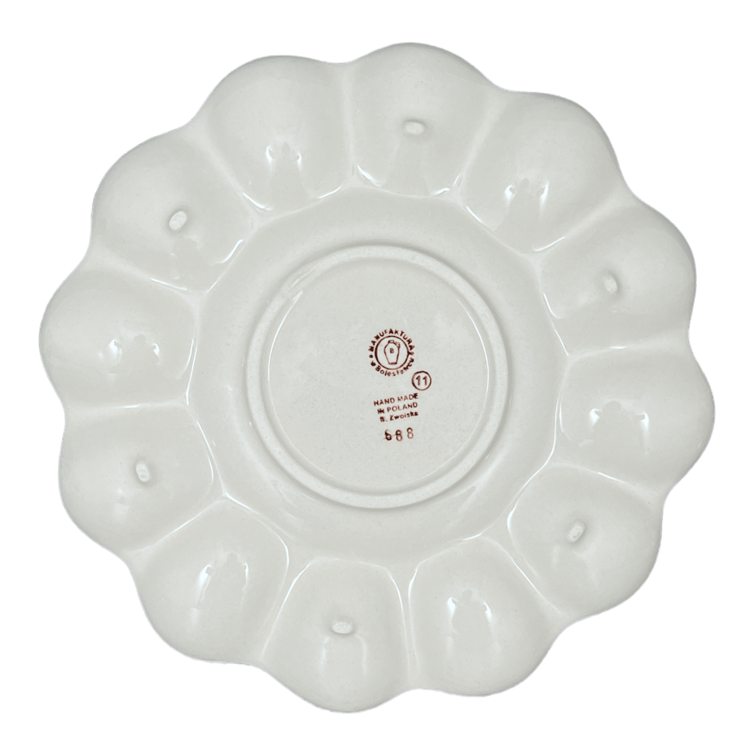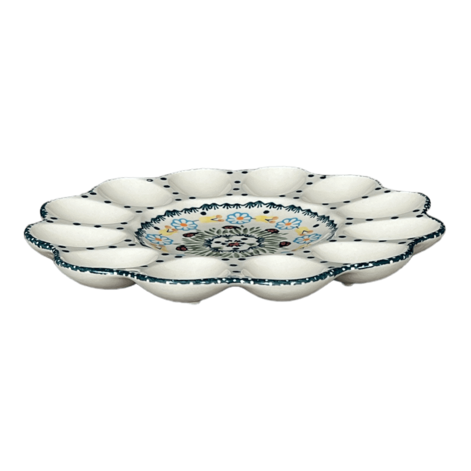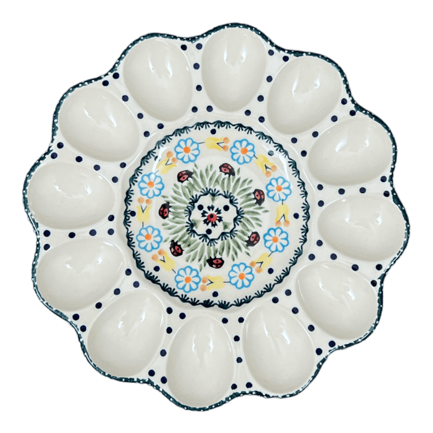 The 10.25" Polish Pottery Egg Plate holds 12 deviled eggs. It's a beautiful way to serve your egg hors d'oeuvres. Also perfect for chocolate covered strawberries!