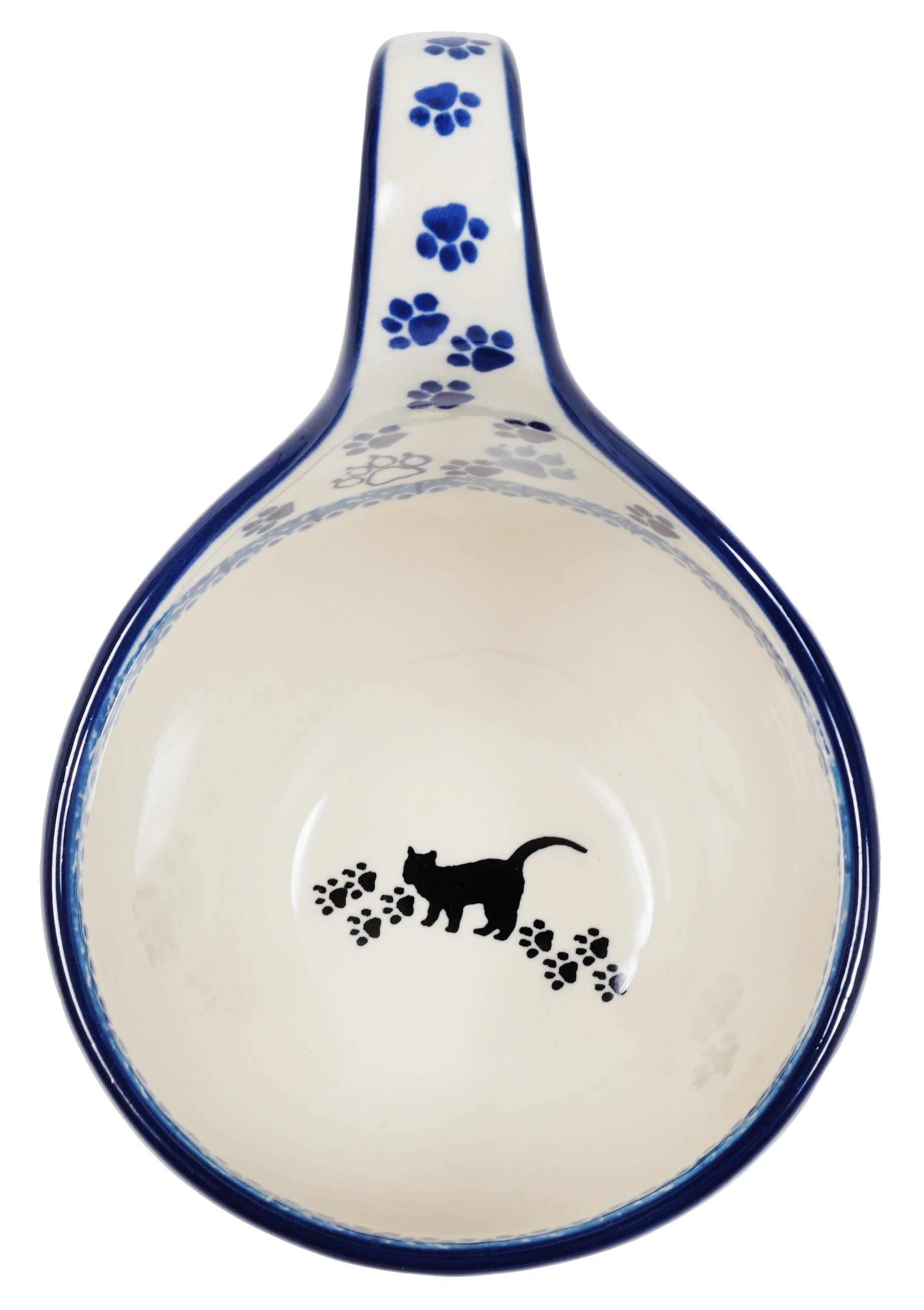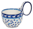 Introducing the Polish Pottery 16 oz. Loop Handle Bowl by Ceramika Artystyczna in the whimsical "Cat Tracks" pattern (1771). These loop-handled bowls are not only practical for enjoying soups, chilis, or stews, but they also add a touch of elegance to your dining experience. And guess what? They have a hidden talent - they can double as a gorgeous scoop for serving punch or cider! How's that for versatility?
