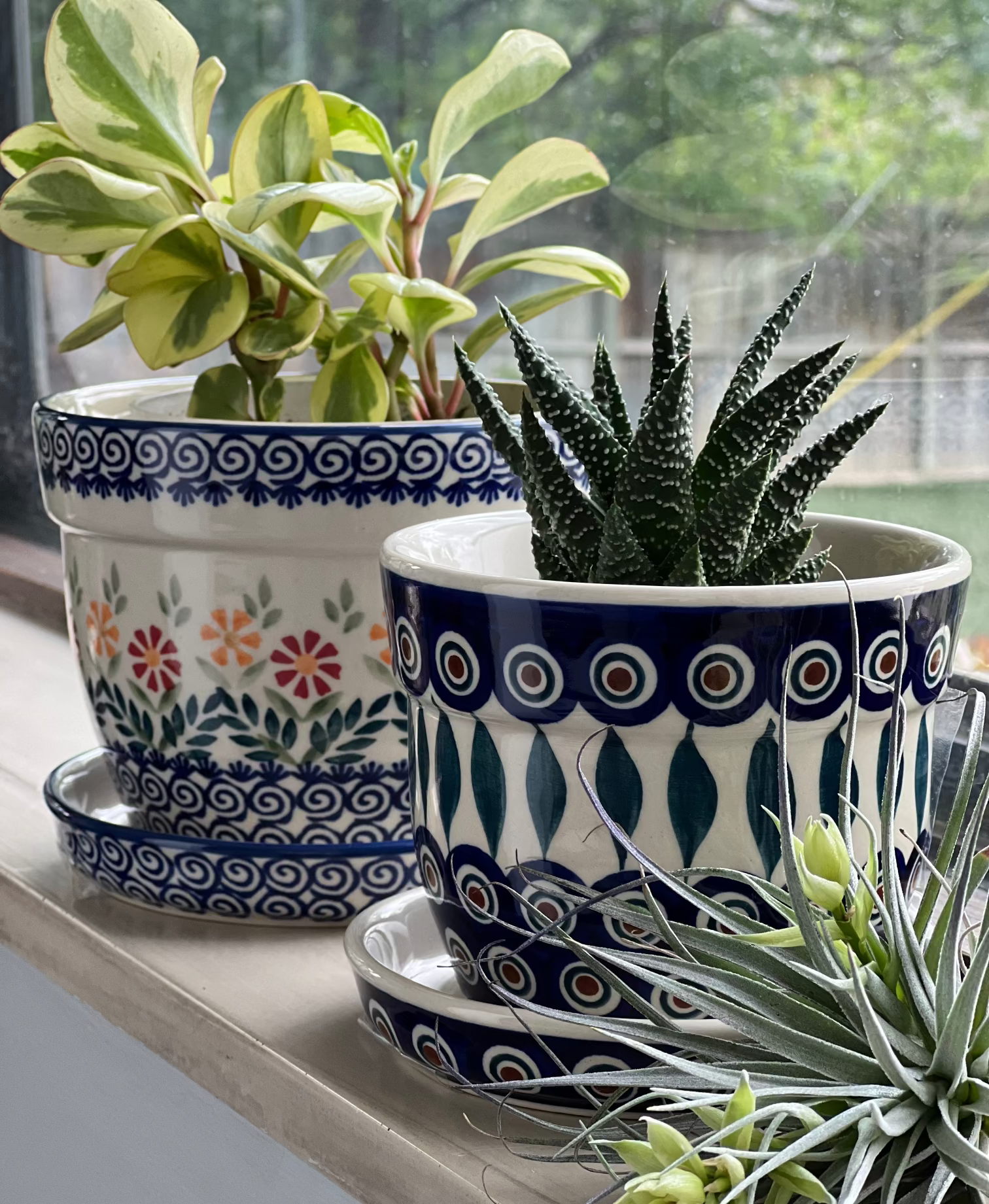 Flower Pot, with Saucer, 6" in "Peacock" by Manufaktura | D036T-54 is backordered and will ship as soon as it is back in stock.