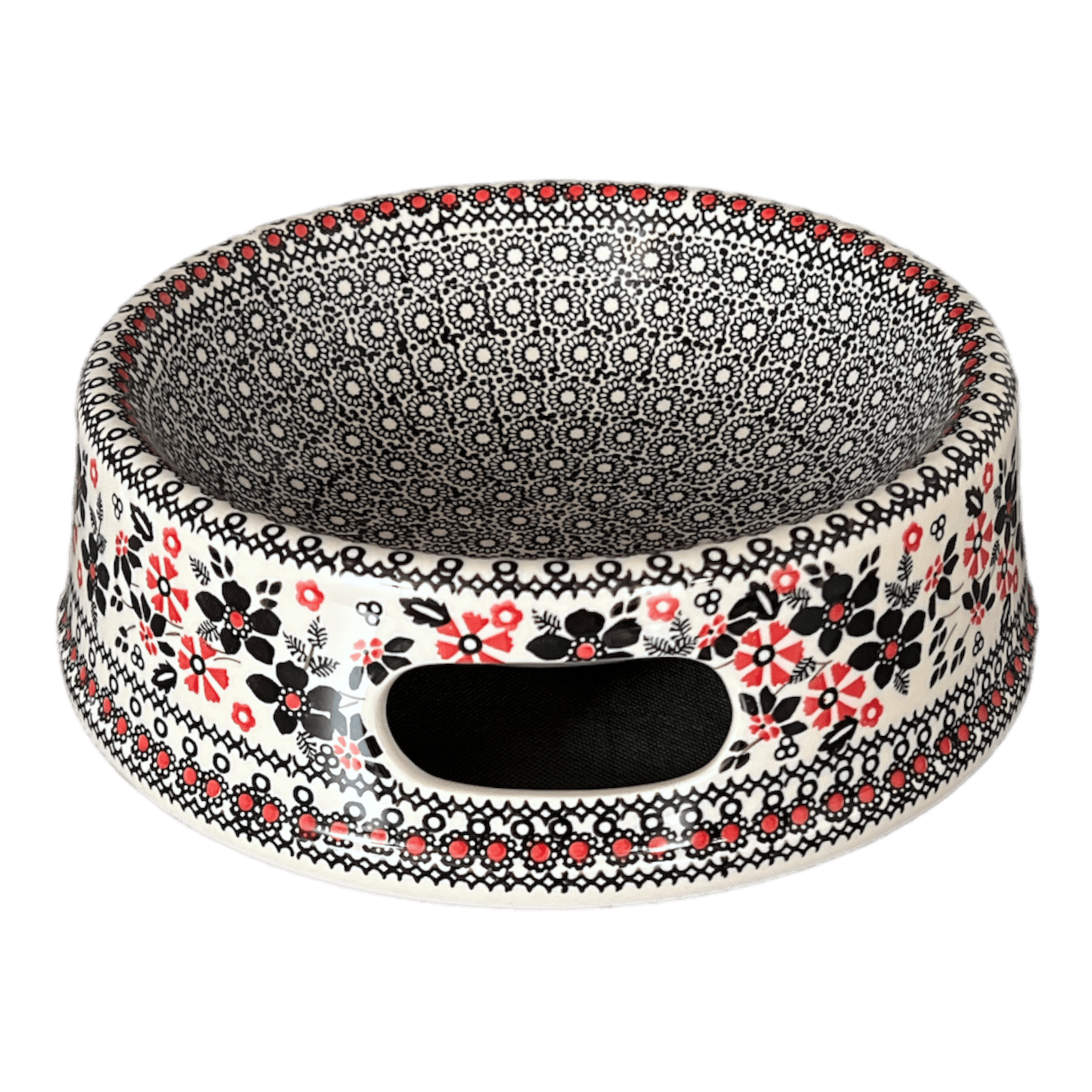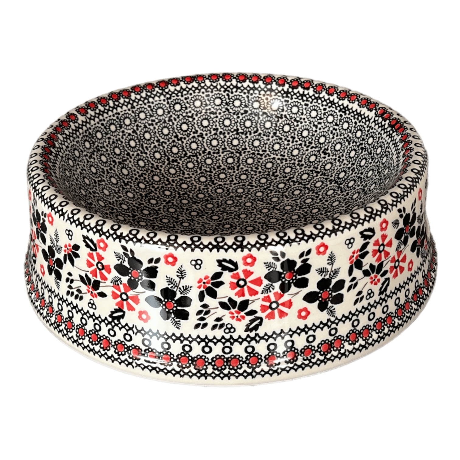 Imagine treating your beloved pup to a dining experience that combines style with exceptional quality. Introducing the Polish Pottery Dog Bowl from Manufaktura, crafted in the heart of Boleslawiec, Poland. This 10.25" large bowl, adorned in the striking "Duet in Black & Red" pattern, is not just a bowl—it's a masterpiece. The design features an elegant white background with a dance of small black flowers at the center, encircled by a vibrant chain of red and black blossoms. This exquisite pattern elevates every meal into a luxurious banquet for your furry friend, making even the simplest kibble look haute cuisine!