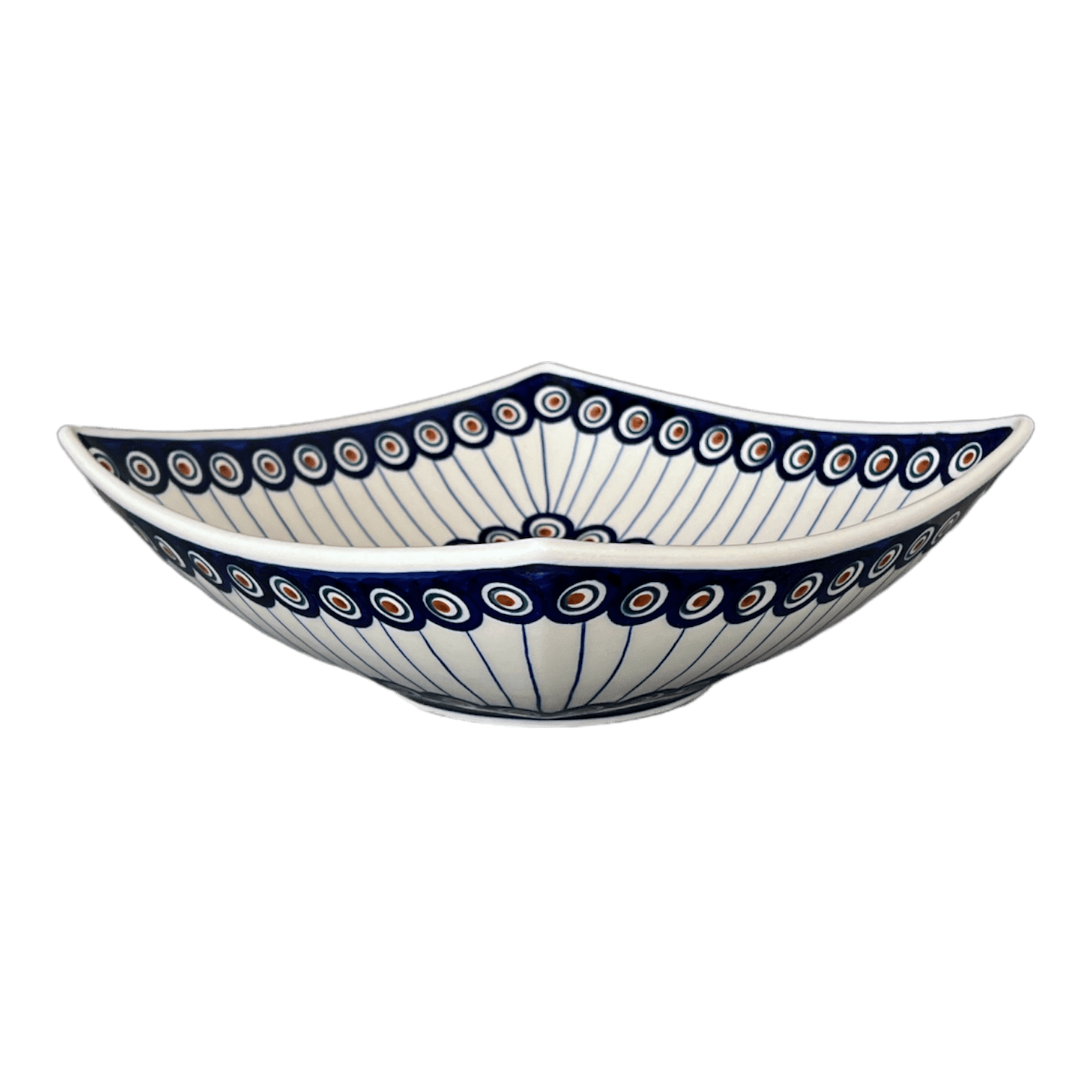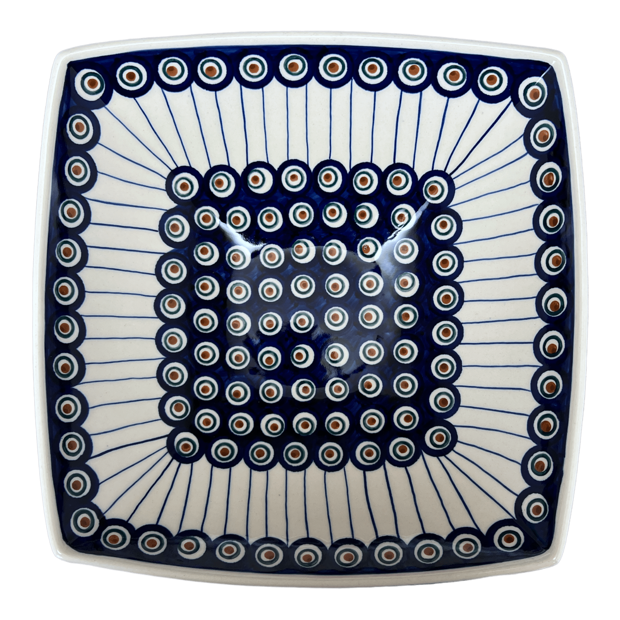 Introducing the Polish Pottery 10.5" Large Nut Dish by Manufaktura in the exquisite "Peacock in Line" pattern (54A). This stunning 10.5" square 'Tall' Nut Dish is not just your ordinary dish, it is the perfect foundation for a centerpiece or a decorative nut and candy dish. Snack away in style with this eye-catching piece!