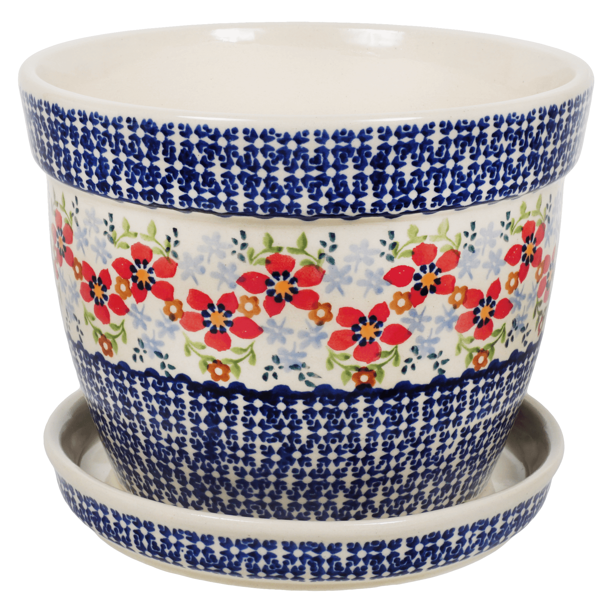 Imagine a burst of summer right in your living room! The Manufaktura Polish Pottery Flower Pot, accompanied by its own saucer and flaunting the vibrant "Summer Bouquet" pattern, is here to dazzle. Picture large, bold red flowers, delicate green leaves, and playful blue and brown accents dancing around a whimsically dotted white background. This 8-inch masterpiece isn't just a flower pot; it's a centerpiece that promises to steal the spotlight from even the most vibrant petunia or charming succulent you decide to nestle inside.