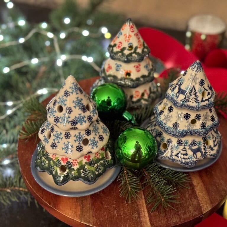 Ignite the magic of the holidays with the enchanting Polish Pottery Luminary Christmas Tree from Galia! Standing at a charming 5 inches and cloaked in the vibrant "Colorful Baubles" pattern, this piece is sure to light up your festive decor. Just slide a tealight candle—be it flickering flame or a safe, battery-operated light—onto its base, cap it with the ceramic tree, and watch as your room transforms with its warm, inviting glow. This delightful luminary is adorned with festive red, blue, and orange ornaments, intertwined with lush green garland, all encircled by a striking cobalt blue rim, bringing the joy and color of Christmas directly into your home.