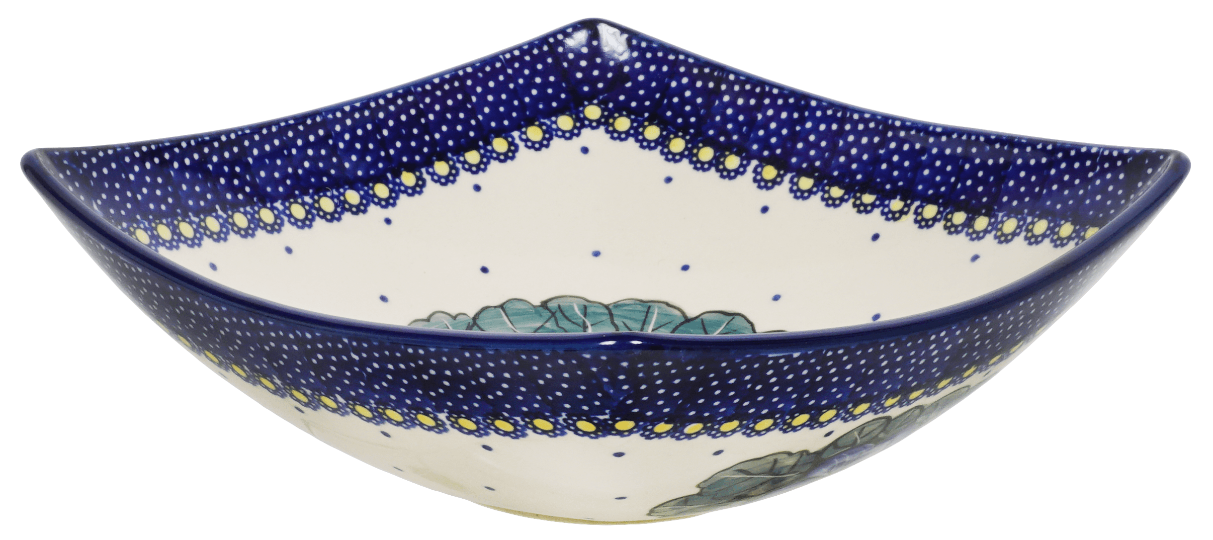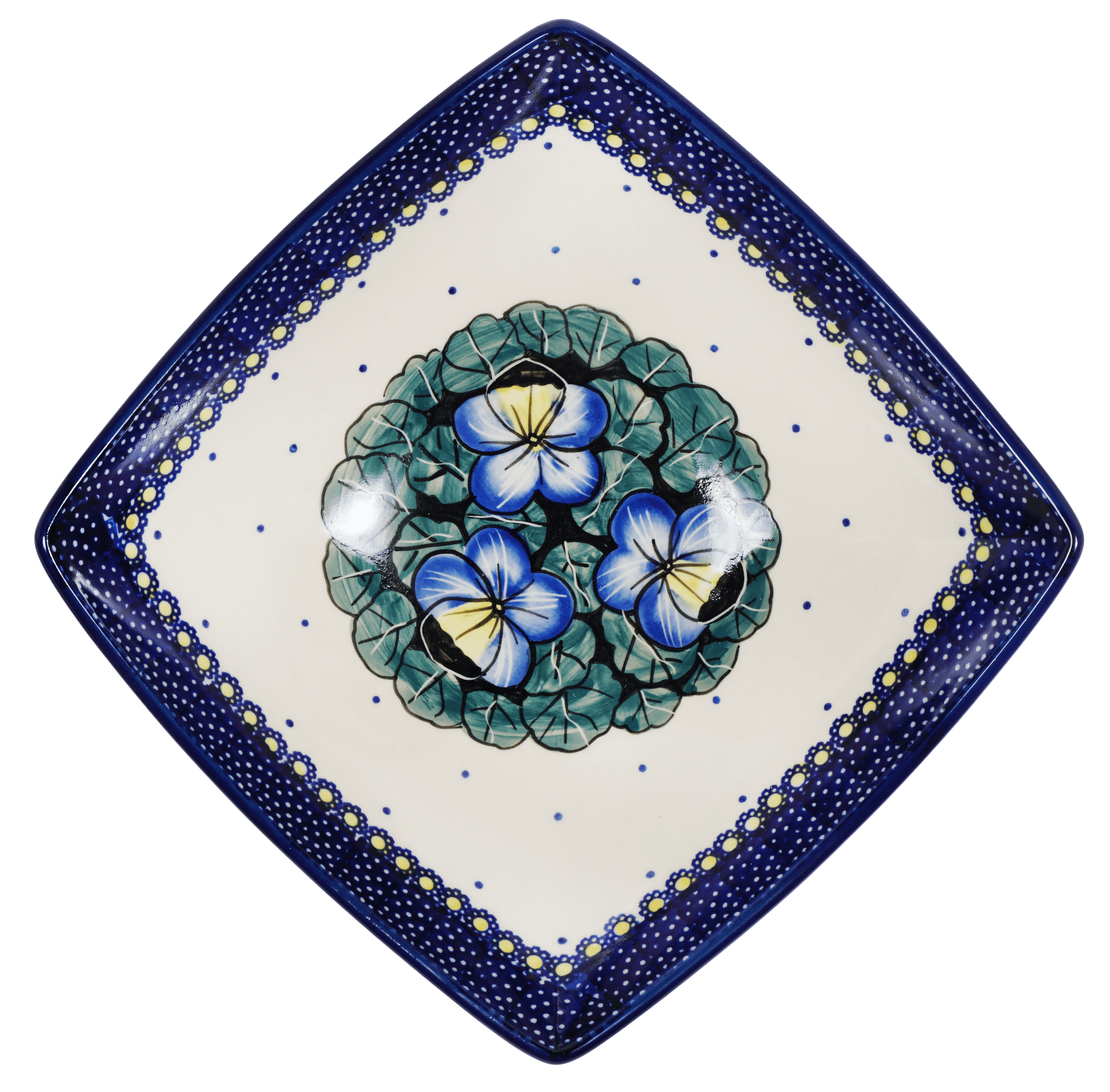 Introducing the enchanting Manufaktura Polish Pottery Bowl, a masterpiece that combines traditional craftsmanship with the elegance of modern design. This square nut bowl, measuring a versatile 7.75 inches, is not just a dish but a conversation starter. Perfectly sized for gatherings or a quiet evening by the sofa during your favorite sports games, it boasts the stunning "Pansies" pattern. Vivid blue flowers, delicately painted with hints of white and yellow, bloom boldly from the center, complemented by a sprinkle of tiny blue dots and lush teal green leaves. This unique design is a testament to the artistry that Manufaktura is famed for, making each piece a collector’s dream.