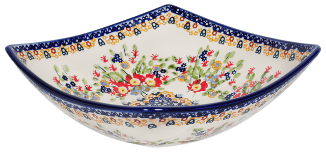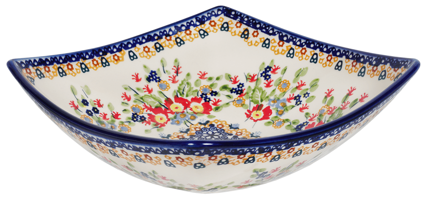 Imagine a splash of vibrant colors nestled on your coffee table, the Polish Pottery Bowl in the exquisite "Poppy Persuasion" pattern is more than just a dish; it's a centerpiece that captivates the eye and sparks conversation. Crafted by the revered artisans of Manufaktura in Boleslawiec, Poland, this medium-sized, 7.75" square nut bowl combines utility with unparalleled artistry. The striking design features a lush white backdrop adorned with a dance of red and yellow flowers, small red and gray clusters, and tiny blue blossoms, all swirling among dense green leaves. This pattern isn't just beautiful; it's a testament to the skill of the artists who have reached the pinnacle of their craft, earning the right to design these signature pieces from start to finish.