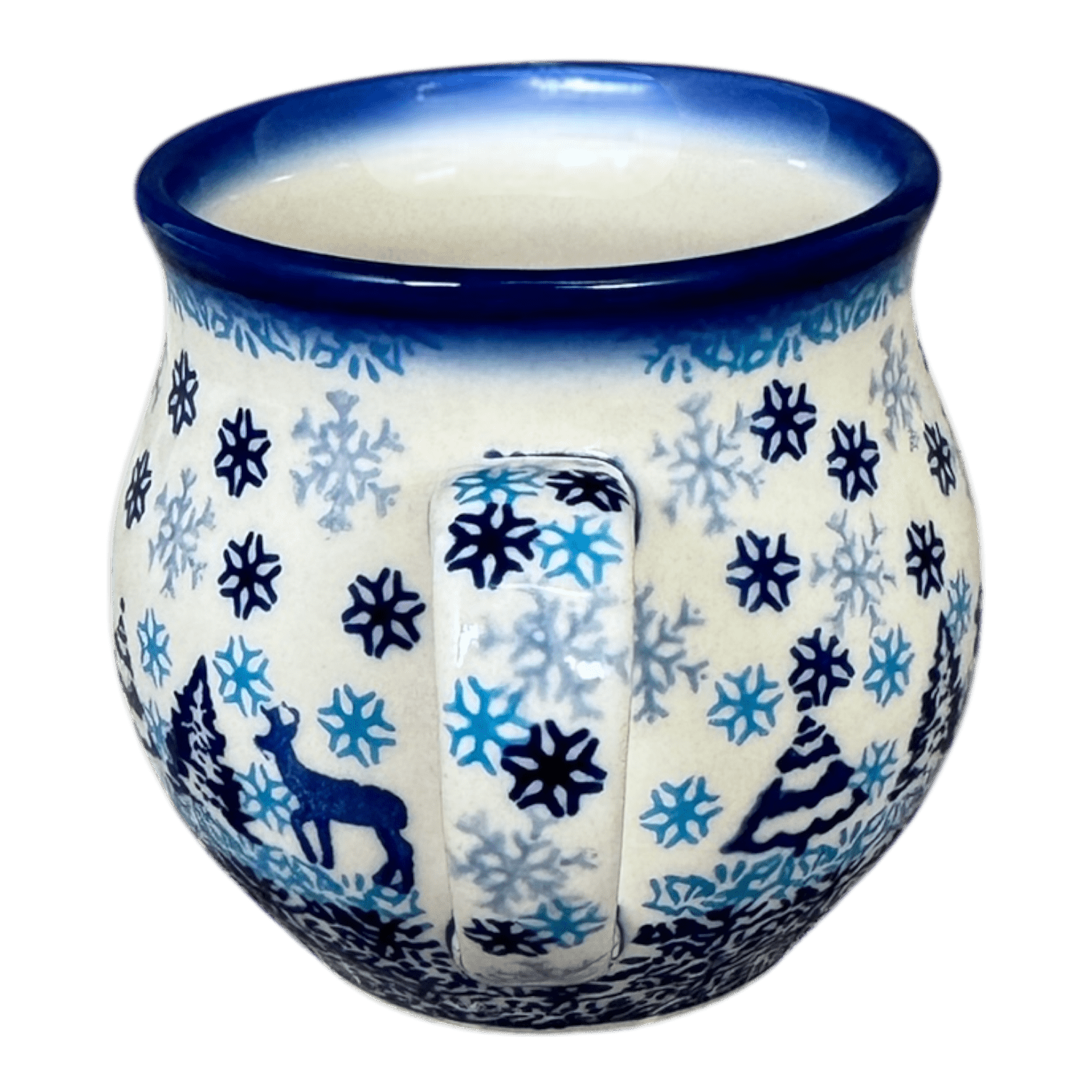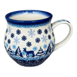 Imagine cradling a cozy, handmade Polish pottery belly mug, brimming with your favorite steaming beverage on a chilly winter morning. The "Snowy Night" design by Galia wraps you in the warmth of the holiday season, showcasing a serene pattern of blue snowflakes dancing around a charming Christmas tree and frolicking reindeer. Edged with a dark blue rim, this mug isn’t just a drink container—it’s a piece of art, boasting a traditional Polish pattern known for its vibrant, cobalt blue hues and light blue accents, meticulously crafted by the skilled artisans of Boleslawiec, Poland.