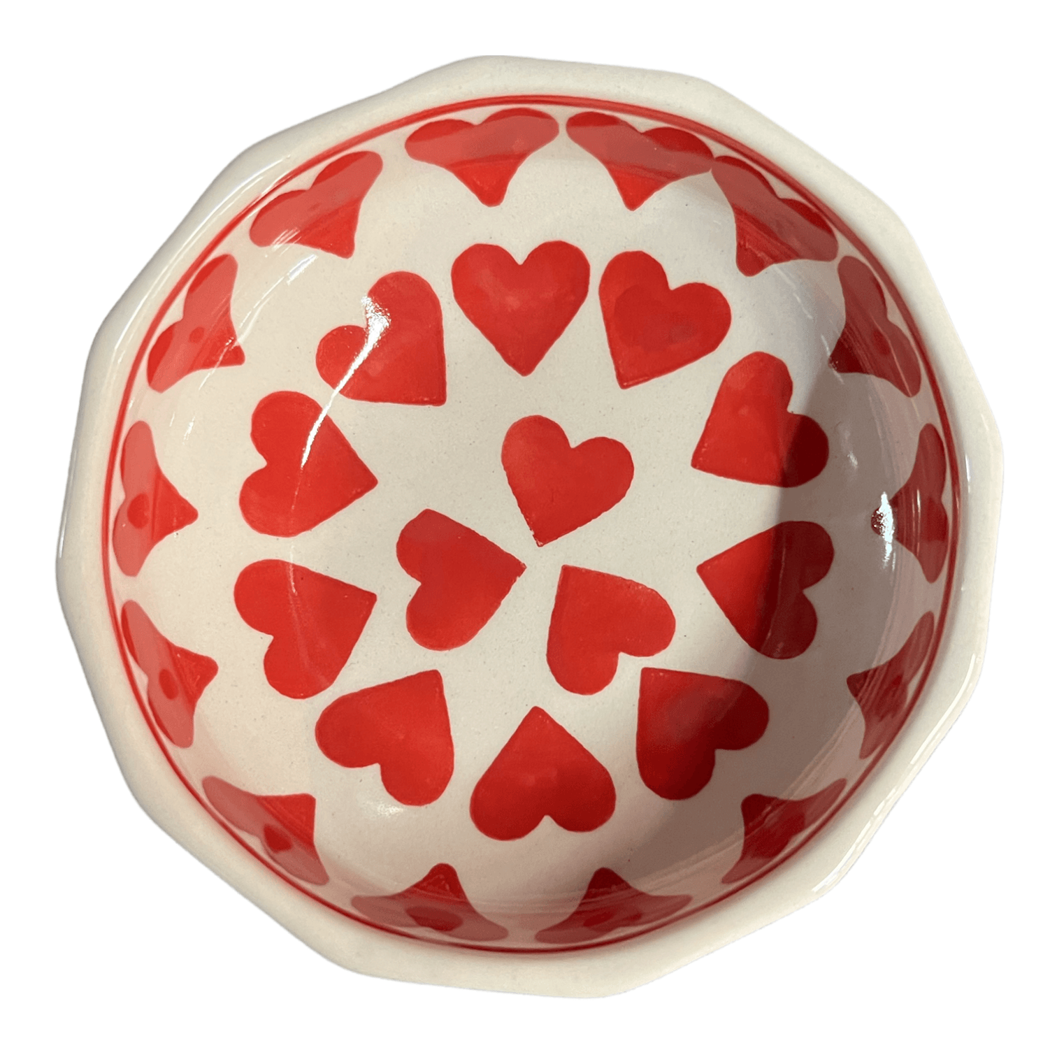 Introducing the Polish Pottery 5" Round Multiangular Bowl by Manufaktura in the captivating "Whole Hearted Red" pattern! These bowls are not only shallow and stylish, but they also have a multitude of uses that will surely spark your imagination. Whether you want to serve up some delectable dips, tantalizing sides, refreshing ice cream, or even display your favorite jewelry pieces, these versatile bowls have got you covered!
