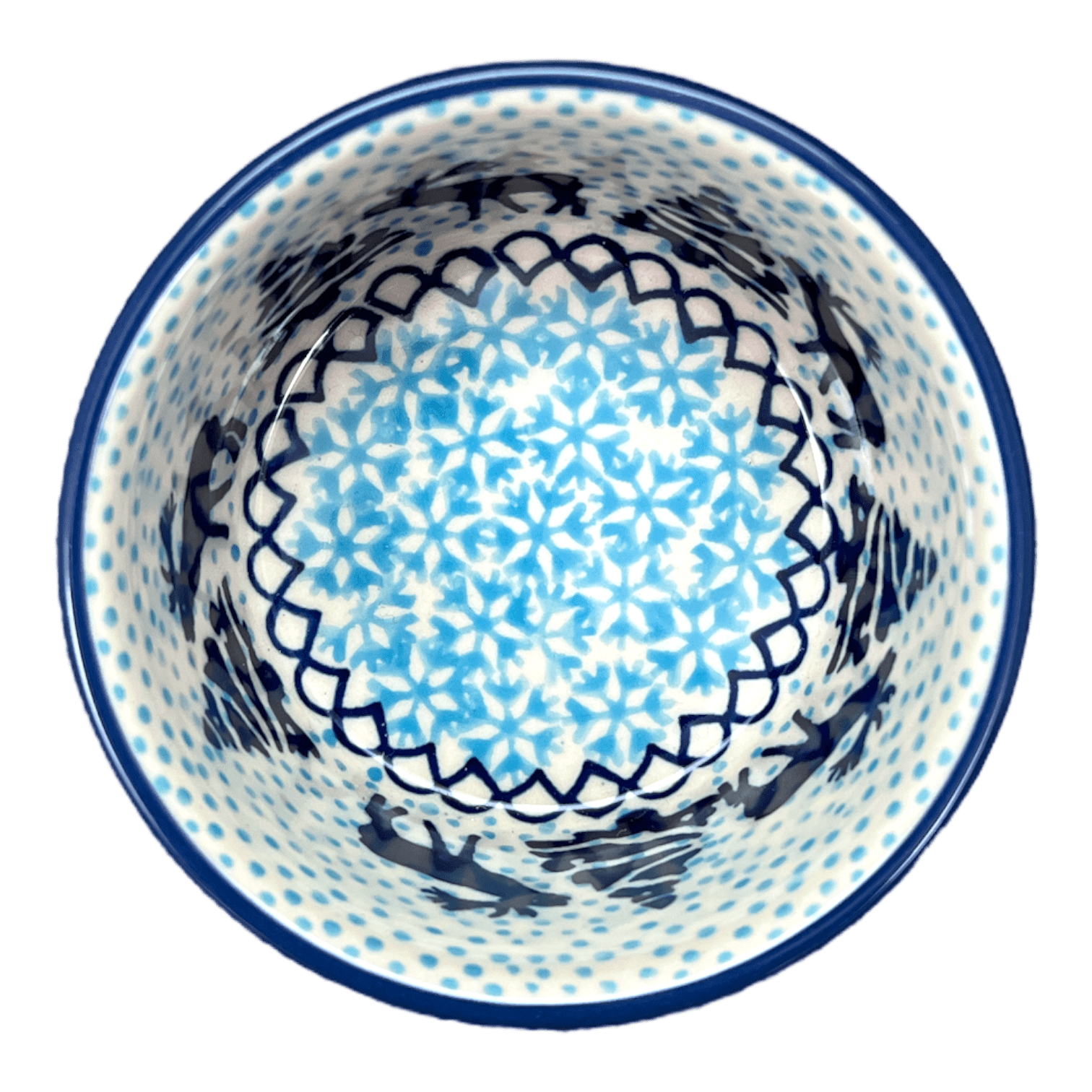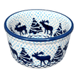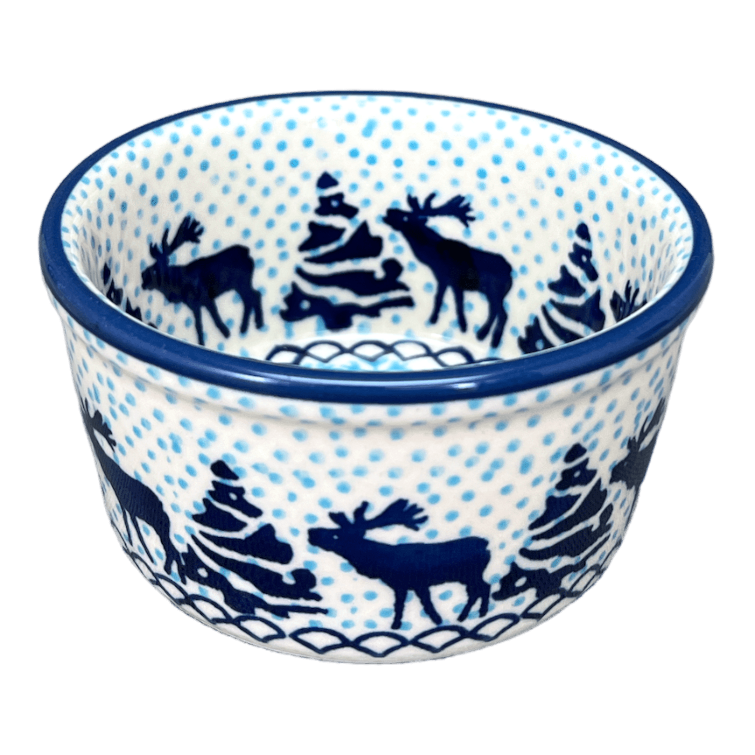 Step into a winter wonderland with every use of the enchanting Polish Pottery Ramekin by Manufaktura, dressed in the "Peaceful Season" pattern. Imagine serving your favorite holiday treats in these charming 7 oz vessels, each adorned with festive motifs that include a serene landscape of moose and Christmas trees, all enveloped by a flurry of delicate snowflakes. The soft light blue backdrop, highlighted by dark blue and white accents, invites a cozy, joyful atmosphere to your table setting. Whether it's a velvety custard, a vibrant dip, or a sweet soufflé, these ramekins turn every dish into a celebration of the season.
