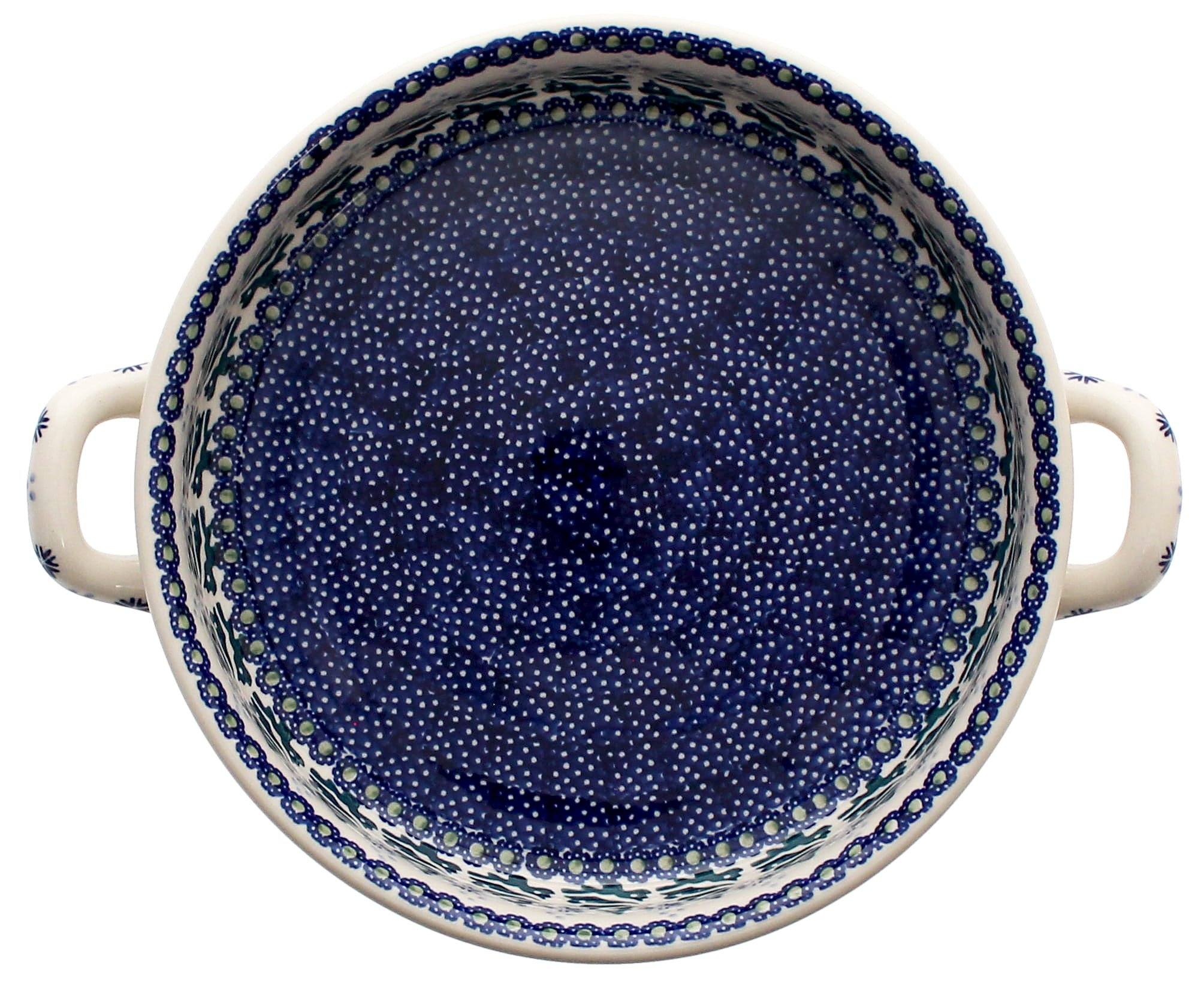 Imagine a wintry scene right in your kitchen every time you bake! The Manufaktura Polish Pottery Casserole dish, adorned with the enchanting "Snowy Pines" pattern, transports the magic of crisp, snowy forests to your table. This 9.25" round beauty isn’t just a feast for the eyes; it's crafted to make your baking a breeze. Whether you're whipping up a hearty casserole or a sweet sponge cake, this dish combines flawless function with exquisite form. Its deep blue backdrop is speckled with delicate white dots, surrounded by a charming circle of teal Christmas trees and flanked by bands of simple blue snowflakes. This traditional piece of art is hand-painted in Boleslawiec, Poland, by artisans whose skill shines in every detail.