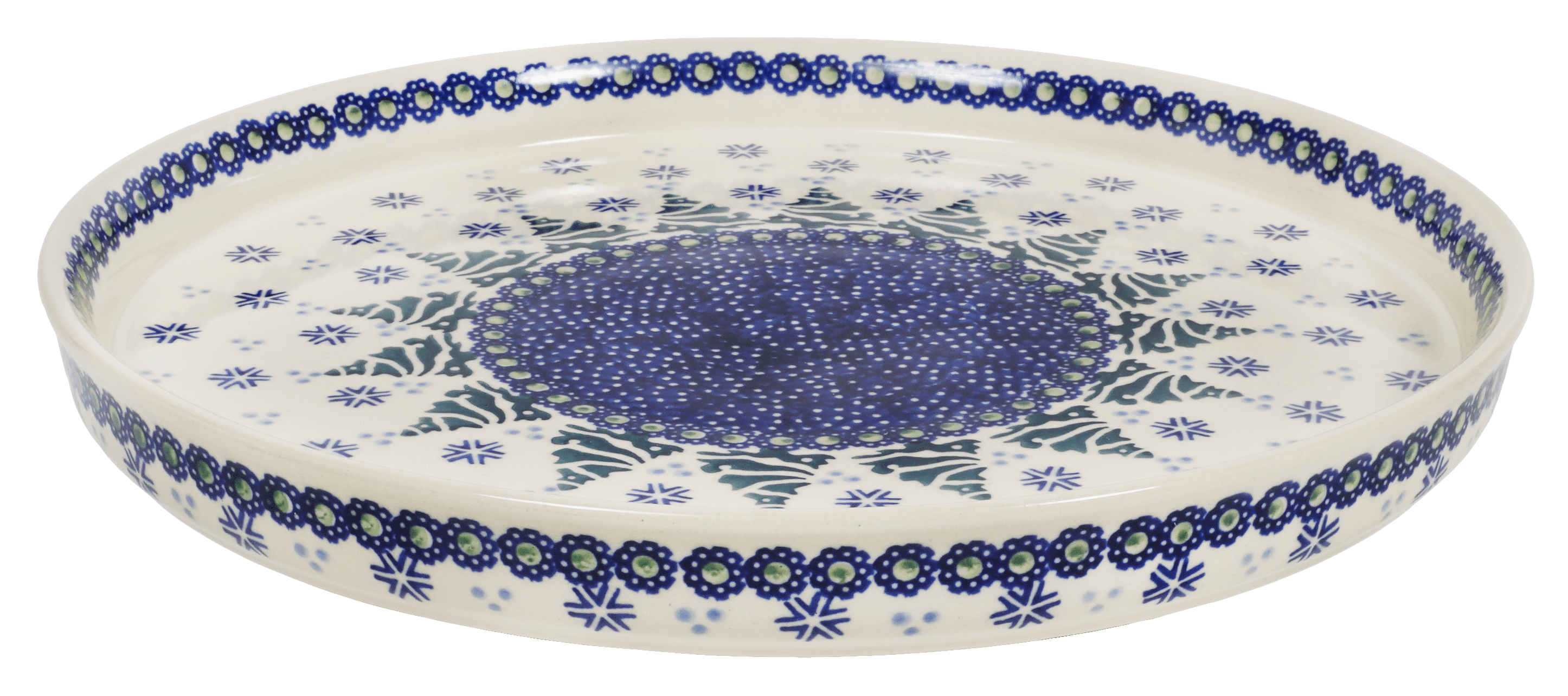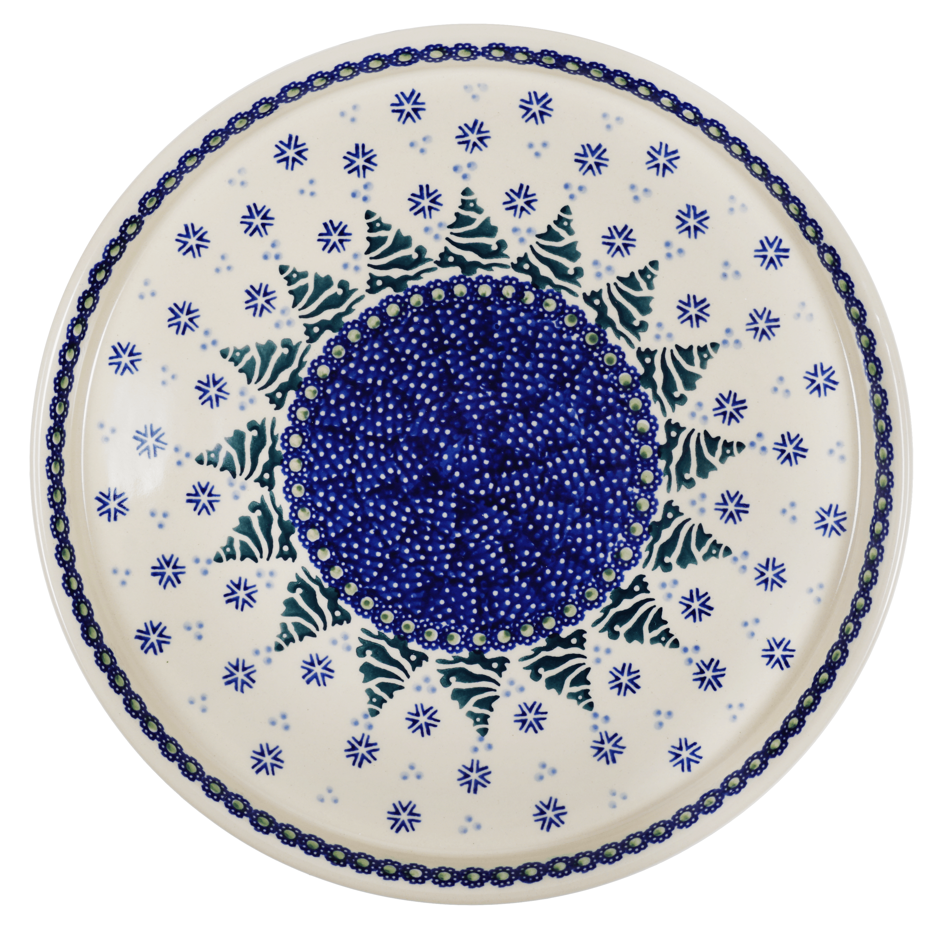 Imagine a winter wonderland captured on a tray, and you have the exquisite Manufaktura Polish Pottery Tray in the enchanting "Snowy Pines" pattern. This 10.25-inch masterpiece is not just a tray but a portal to a festive, frosty forest. The design features a serene blue background sprinkled with delicate white dots, resembling the gentle fall of snow. Encircling this snowy expanse is a charming band of teal Christmas trees set against a crisp white background, while playful bands of blue snowflakes dance in the sky above. Handcrafted in the renowned workshops of Boleslawiec, Poland, this tray is a testament to the traditional artistry of Polish pottery, where each piece tells its own unique story.