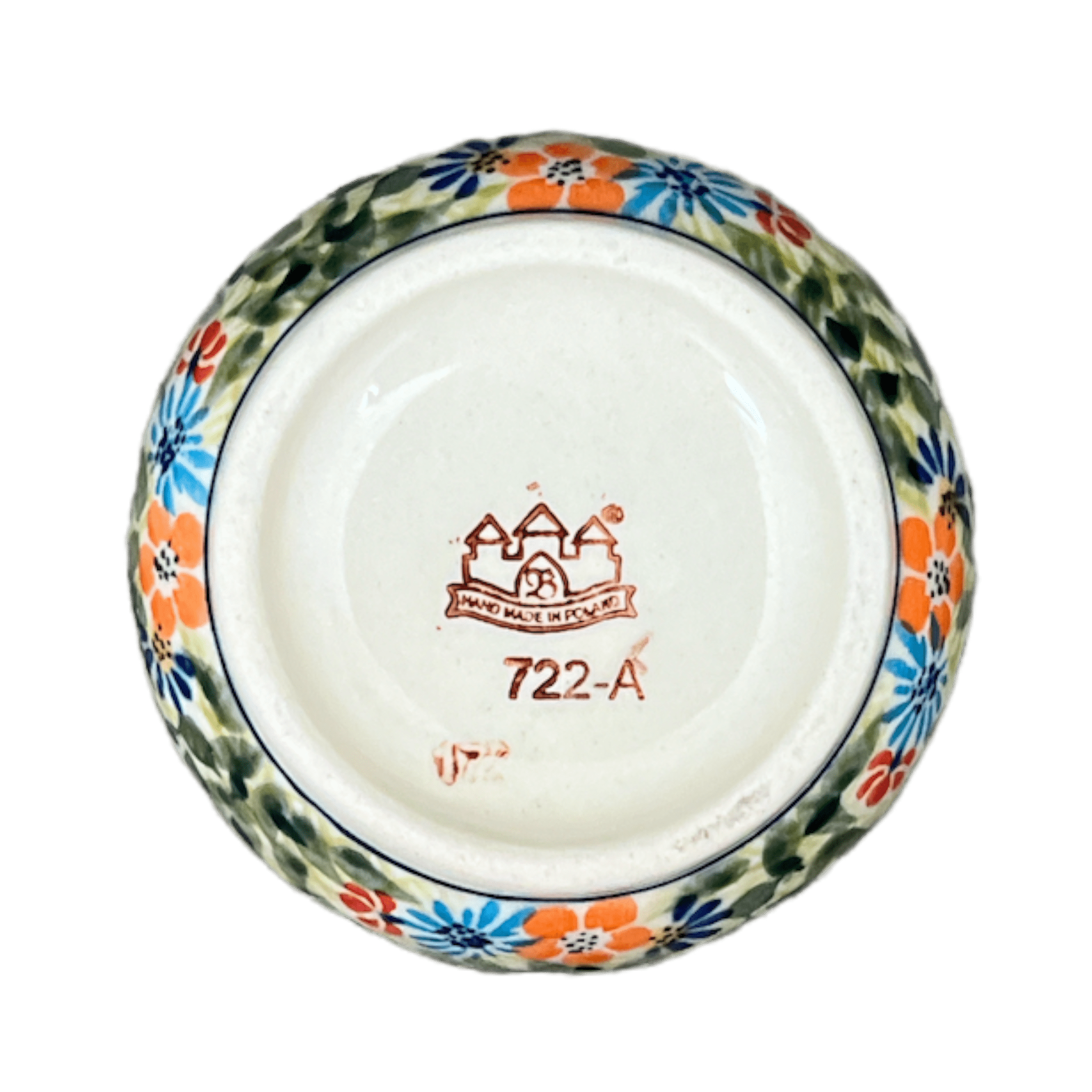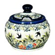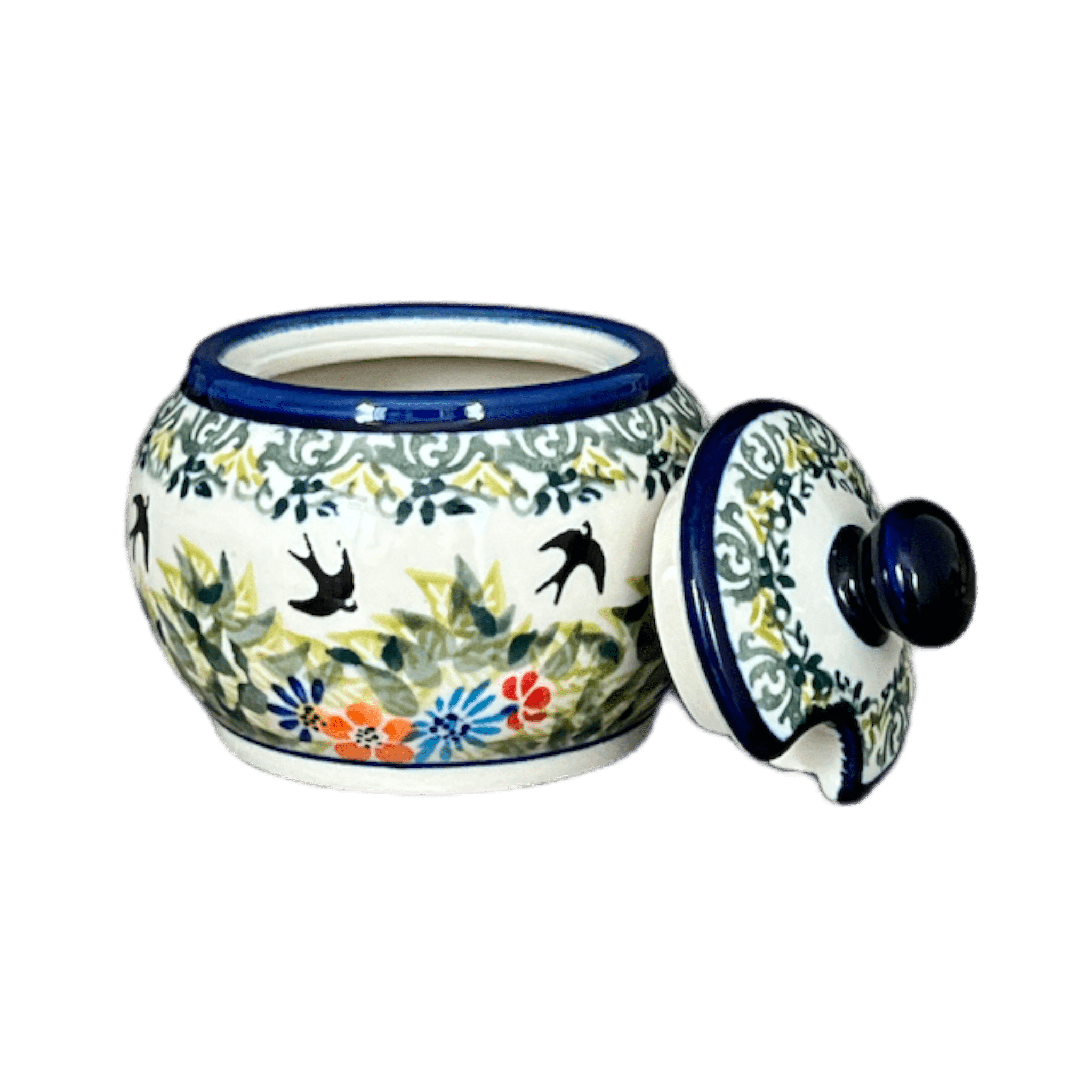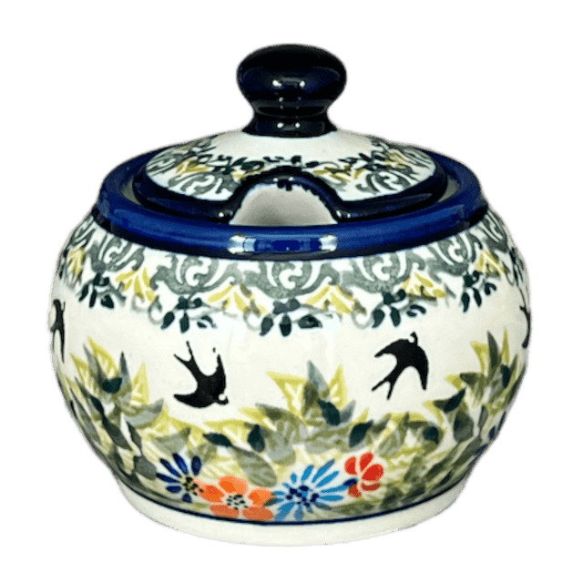 Imagine a dash of enchantment on your dining table with the exquisite Zaklady Polish Pottery Sugar Bowl! Crafted in the heart of Boleslawiec, Poland, this charming little bowl is a true testament to traditional craftsmanship fused with whimsical artistry. Standing proud at 3.25 inches tall and 3.5 inches in diameter, this delightful piece features the "Floral Swallows" pattern—where playful black swallows soar amidst a vibrant bouquet of orange, blue, and red flowers, set against a serene light blue backdrop. This design isn't just any pattern; it's an Unikat, meaning "Unique" in Polish, showcasing an elevated level of artistry with intricate details and a rich palette of colors.