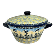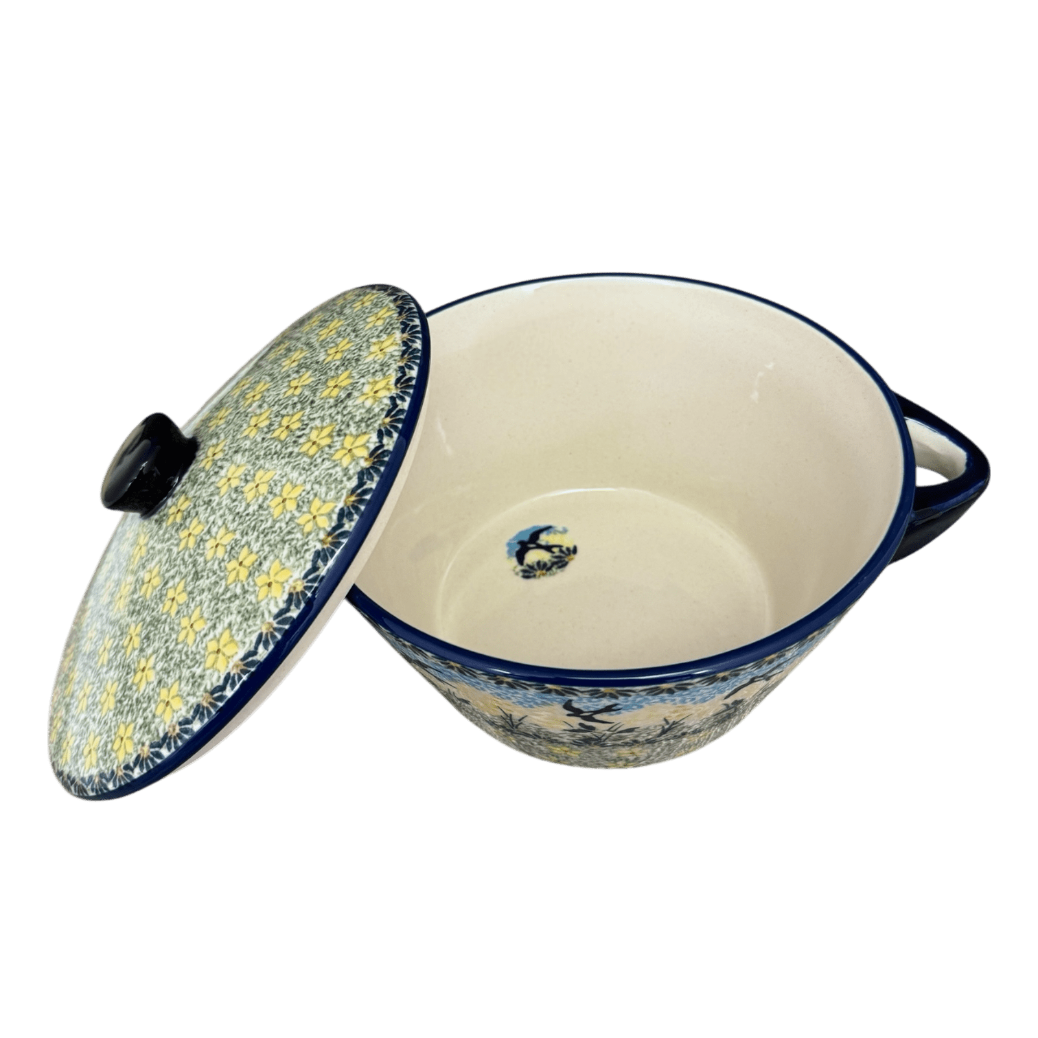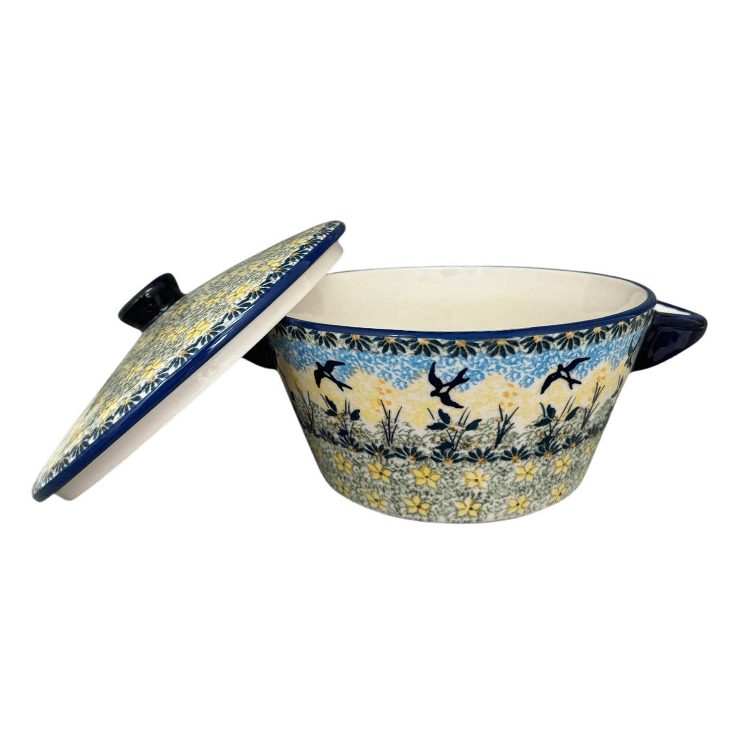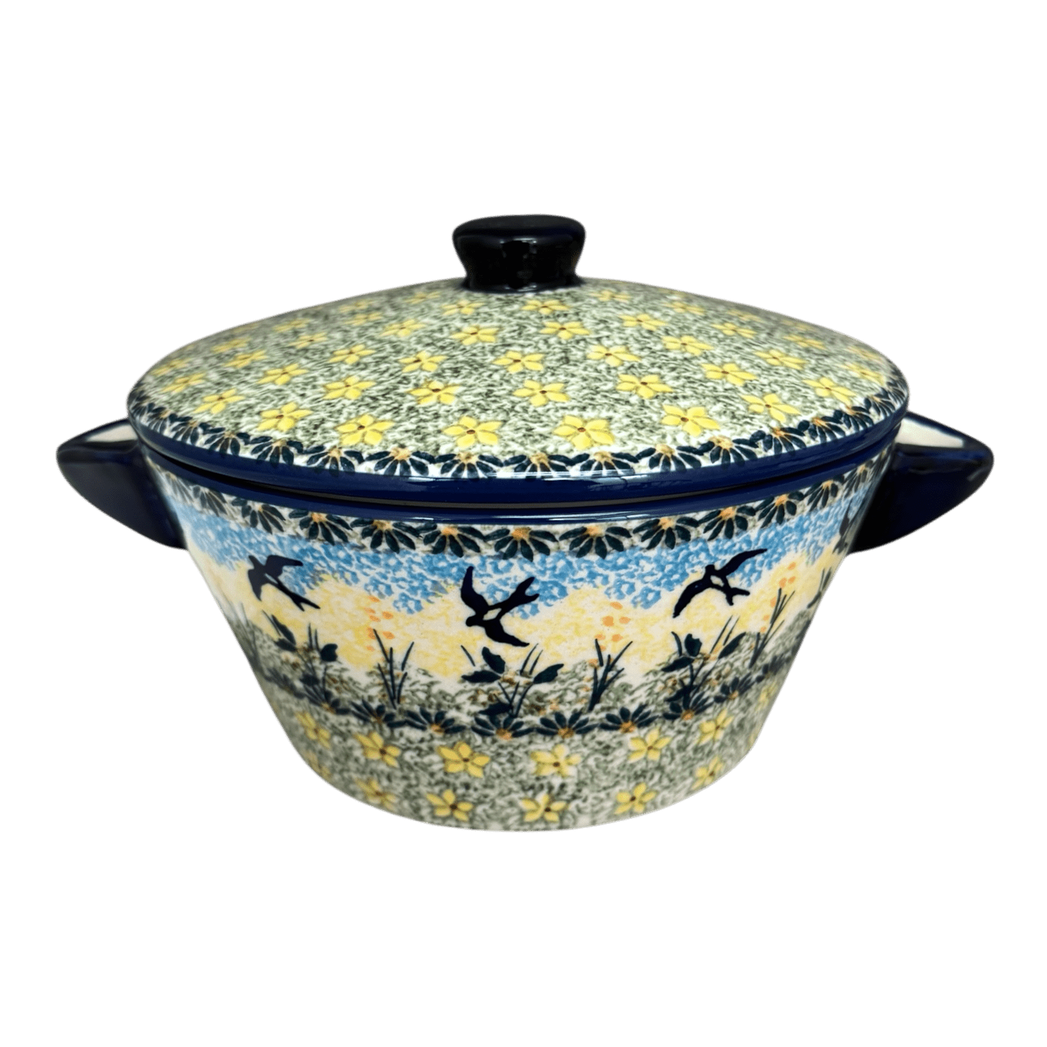 Imagine setting your table with a piece so enchanting, it doubles as a centerpiece. The Polish Pottery Soup Tureen by Manufaktura, adorned with the captivating "Soaring Swallows" pattern, does just that! This exquisite tureen is perfect for serving up your favorite soups and stews, or even as a charming covered casserole dish. The delightful artwork, featuring birds and flowers in hues of blue with sunny yellow and vibrant green accents, brings a splash of color and elegance to any meal. Crafted on a pristine white background, the design includes delicate yellow flowers intertwined with slender green fronds, creating a harmonious blend of nature's beauty right at your dining table.
