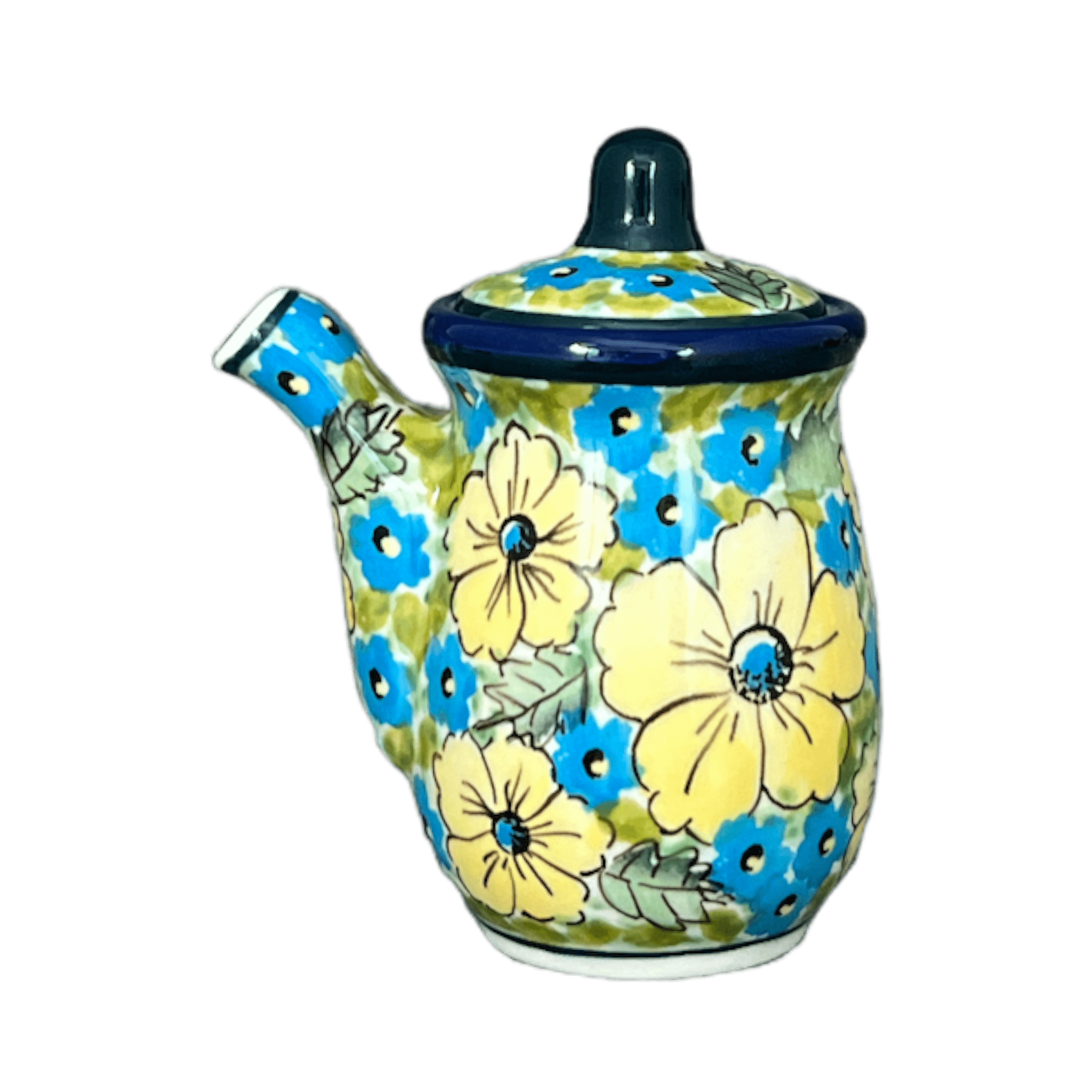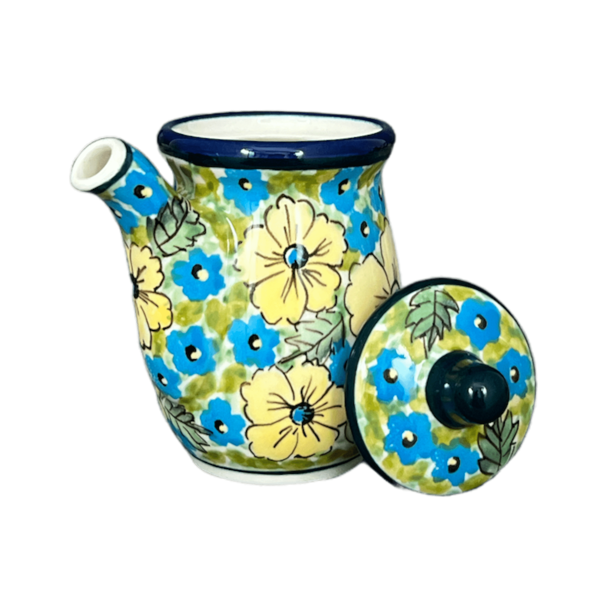 Introducing the charming Polish Pottery Pitcher from Zaklady, a delightful addition to your dining table that's as practical as it is picturesque. This petite 5 oz pitcher, ideal for serving soy sauce or your favorite sauces, comes alive in the vibrant "Sunny Meadow" pattern. Imagine a canvas of lush green, dotted with large, sun-kissed yellow flowers and delicate blue blooms, hand-painted by master artisans in Boleslawiec, Poland. The exquisite color palette not only enhances the aesthetic appeal of your table setting but also invites a cheerful vibe to any meal.