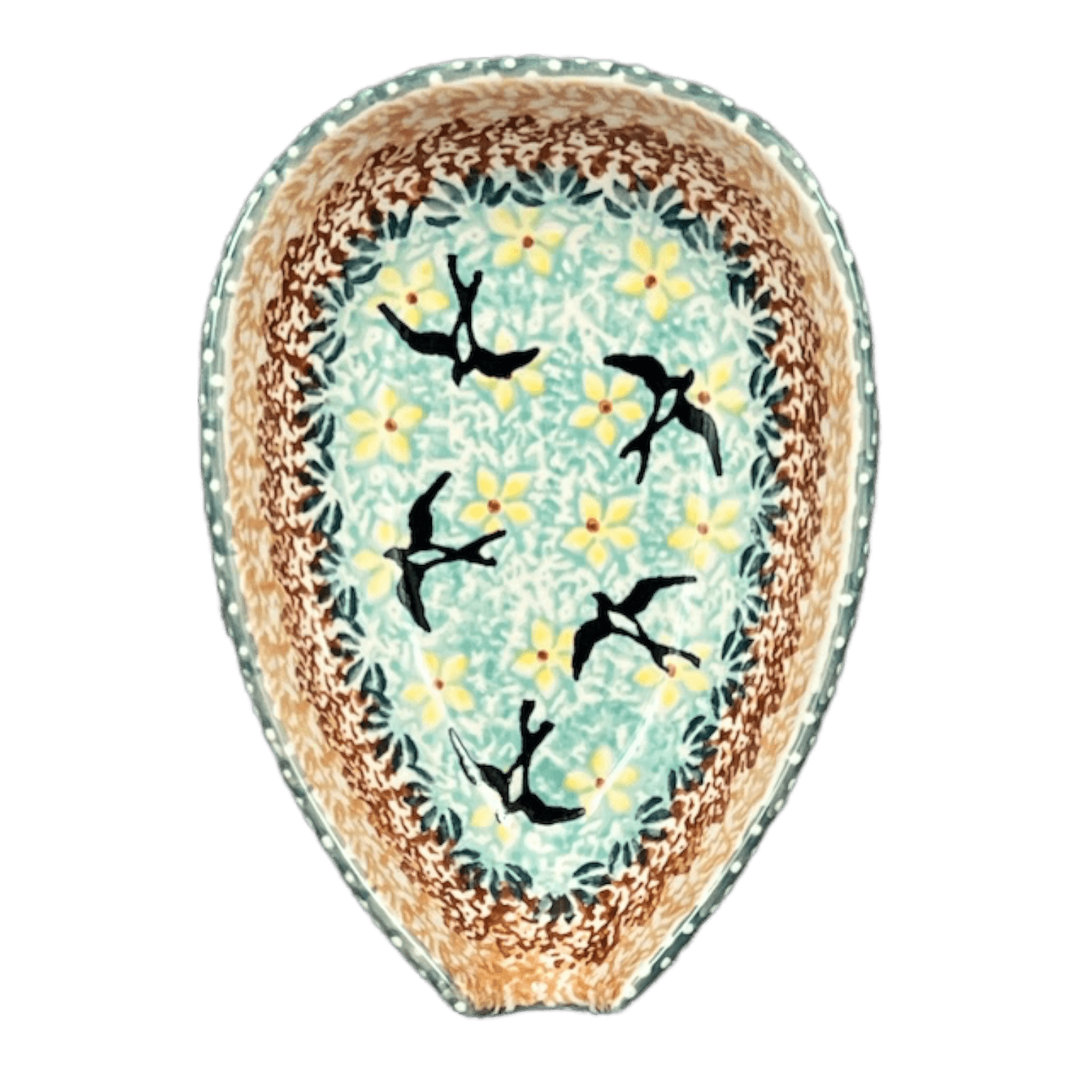Imagine a quaint kitchen, the heart of the home, where the fragrance of simmering soup fills the air. Now picture a charming Polish Pottery Spoon Rest from Manufaktura, resting on your counter, waiting to cradle your steaming spoon with grace. This isn't just any spoon rest; it's a small but mighty warrior against messes, measuring a convenient 3.5 inches. Crafted in the delightful "Capistrano" pattern, it showcases a dance of bird and flower motifs across a crisp white background, painted by hand in vibrant shades of green, yellow, brown, and black. Not only does it capture the eye, but its glossy surface promises an easy cleanup—just pop it in the dishwasher and voilà !