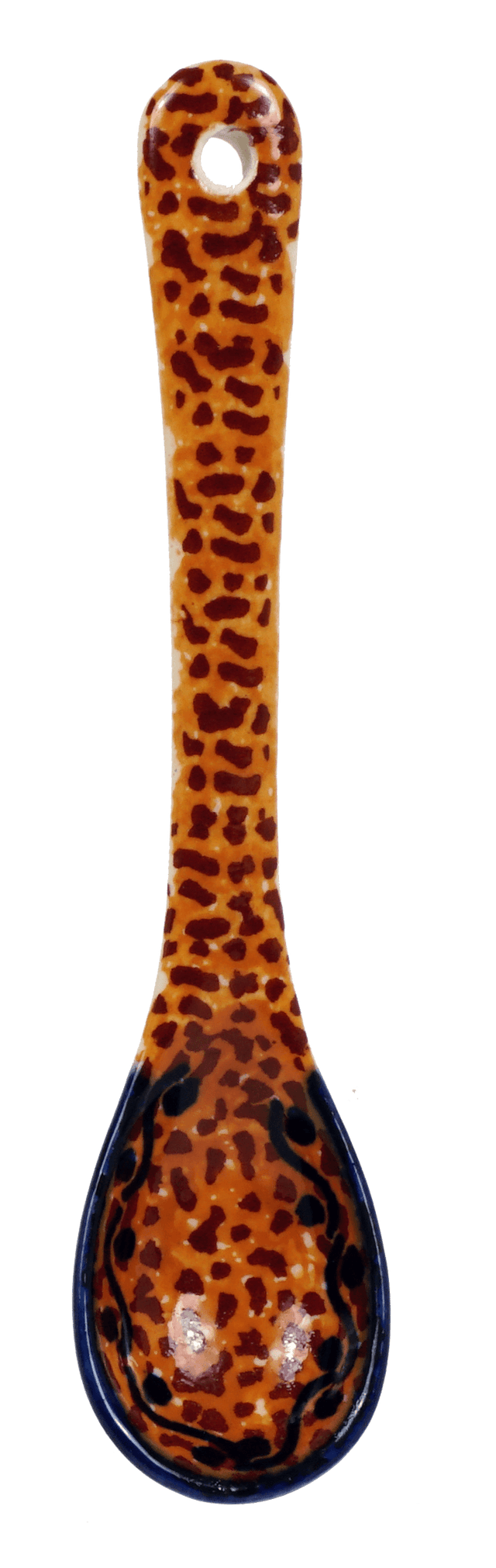 Indulge in the artistry and craftsmanship of Polish pottery with this beautiful 5" sugar spoon in the "Desert Sunrise" pattern. Hand-decorated by skilled artisans in Boleslawiec, Poland, this ceramic spoon is both functional and stunningly beautiful. The intricate design elements of Geometric shapes in Brown, Orange, Blue, and Yellow create a truly unique and eye-catching piece.
