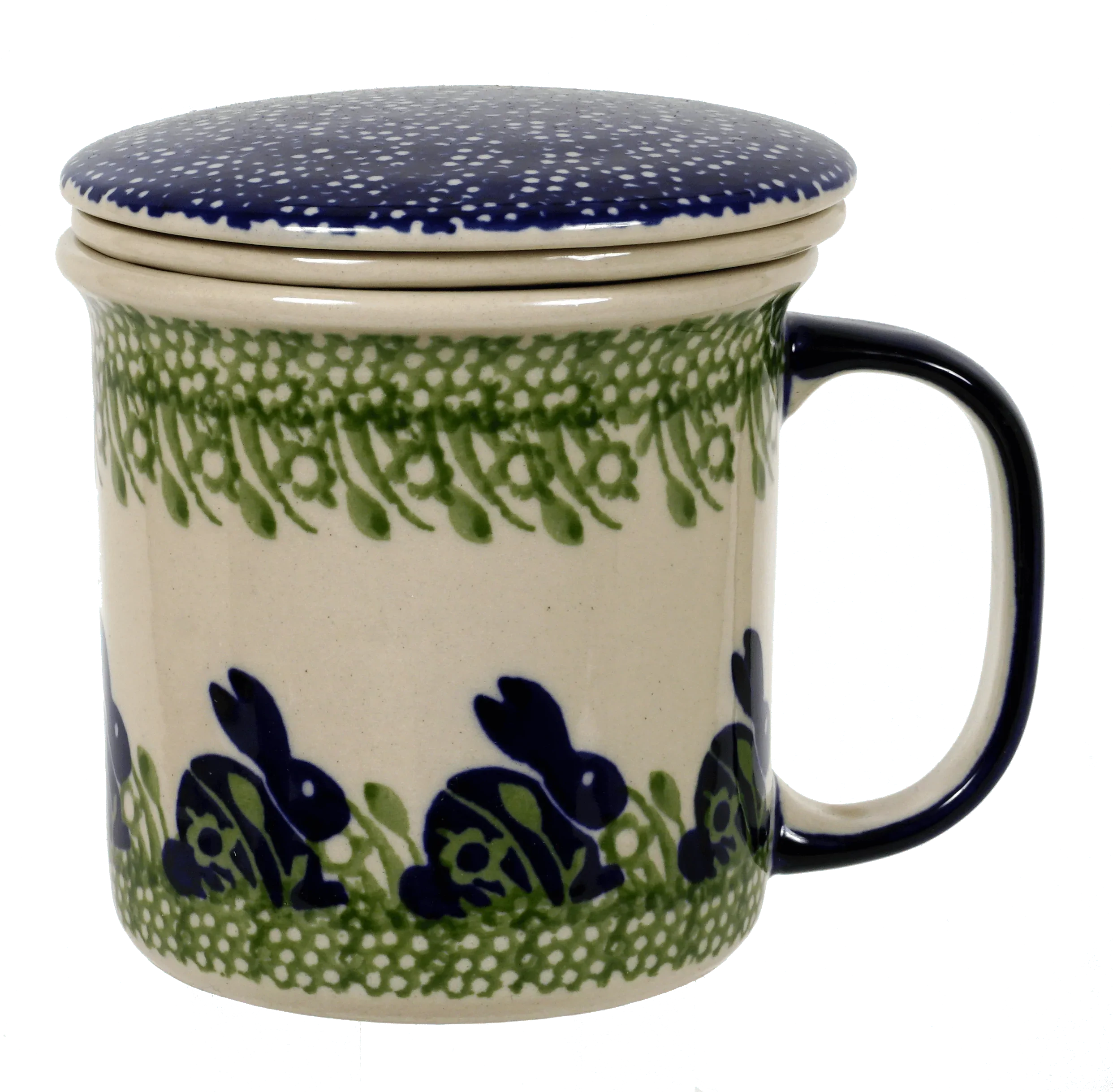 Introducing the Polish Pottery 12 oz. Tea Infuser Mug by Manufaktura in the adorable "Bunny Love" pattern (P324). This charming three-piece set is the perfect companion for a delightful single serving of loose-leaf tea! Imagine adding your favorite tea to the infuser, pouring in boiling water, and then popping on the lid to keep it piping hot while it steeps. Talk about convenience!