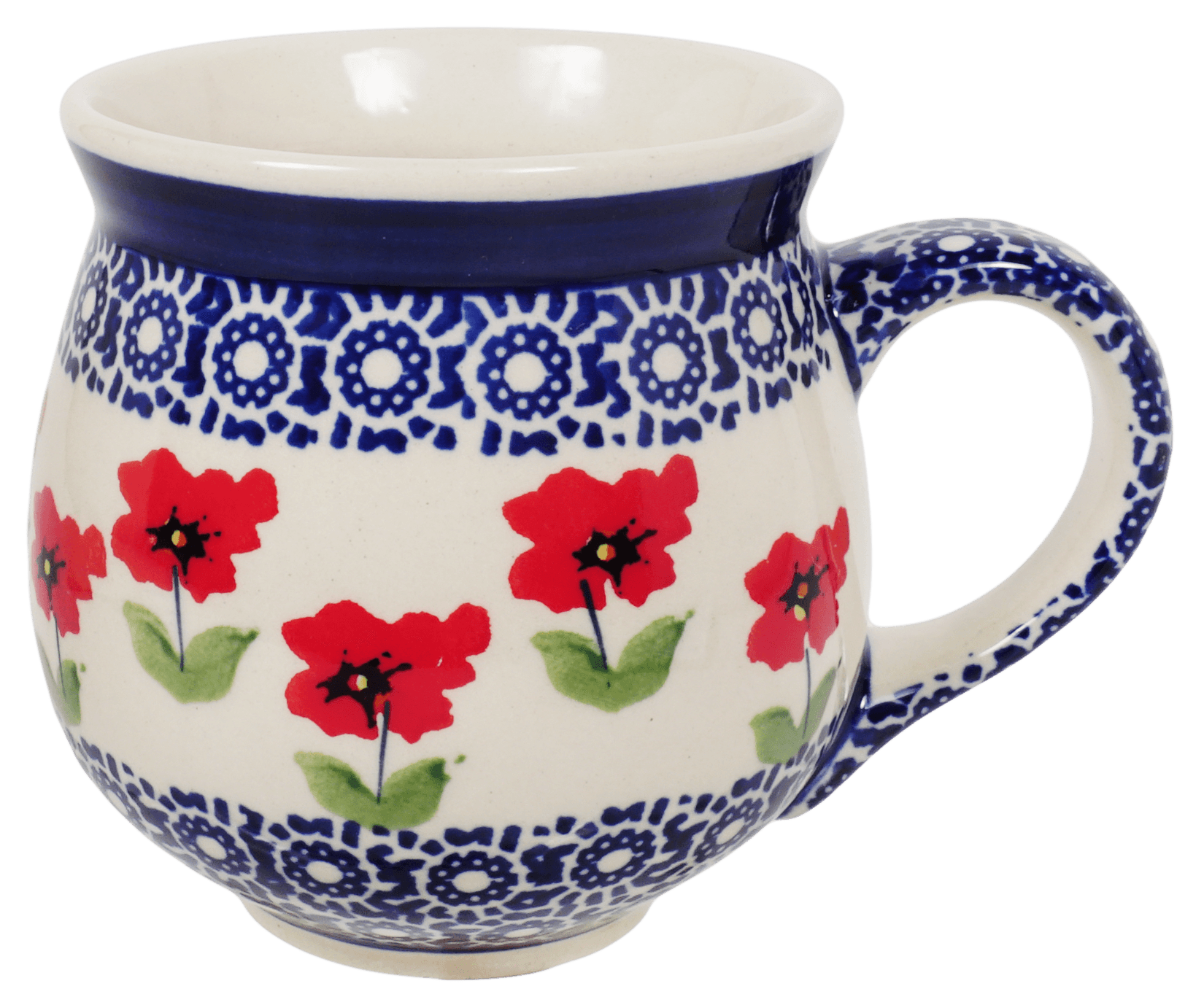 Imagine starting your day with a warm embrace from a uniquely charming coffee cup - the 10 oz. Medium Belly Mug from Manufaktura, adorned with the vibrant "Poppy Garden" pattern. This delightful mug is more than just a container for your morning brew; it's a piece of art that perks up your spirit as much as your caffeine does! The "Poppy Garden" design features an enchanting array of flowers painted in predominantly red hues with playful accents of blue, white, and green. The center showcases simple white flowers set against a soothing blue backdrop, while a lively band of large poppies with green stems dances around it, creating a visual symphony that's sure to brighten any day.