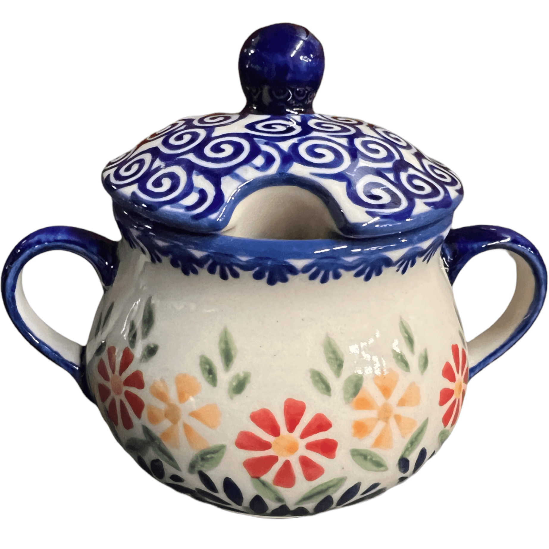 Introducing the enchanting Manufaktura Polish Pottery Sugar Bowl, a masterpiece that blends functionality with the whimsy of the "Flower Power" pattern. This delightful bowl, measuring a quaint 3.5 inches, is not just a container but a statement piece, adorned with a vibrant palette of reds, oranges, blues, and whites. Each bowl is a canvas where nature comes to life through the traditional art of hand stenciling. Imagine this charming piece on your kitchen counter or dining table, turning everyday moments into sweet, artistic encounters.